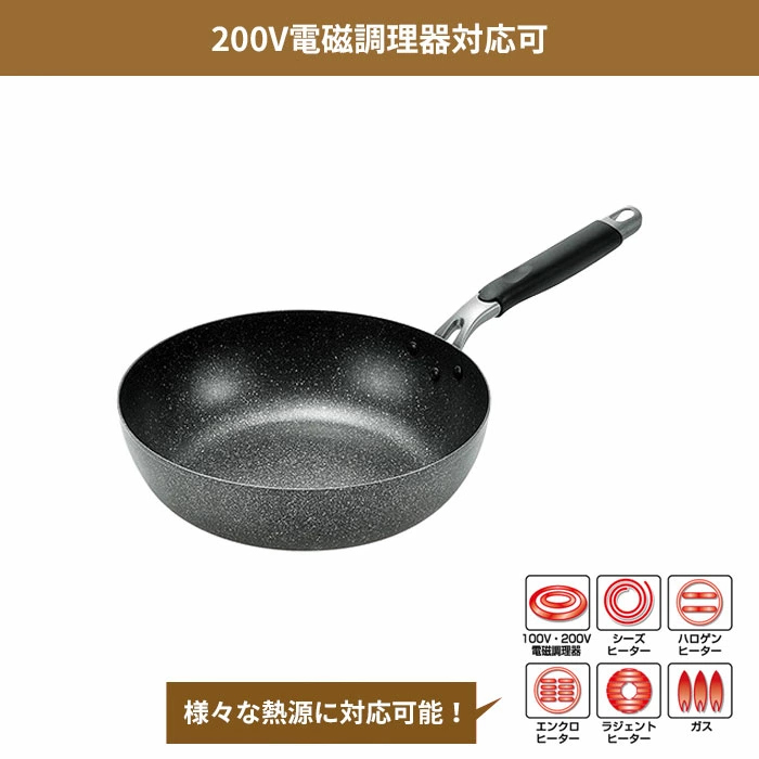 | プライマーコートにダイヤモンド粒子を配合した3層ハードコートでキズに強く、金属ヘラも使用OKな炒め鍋。 JIS S2010に準ずる耐摩耗性試験において100万回をクリア。 側面の厚さを薄くし、軽量化を実現。 少量の油で調理できるので健康的で経済的。 汚れもサッとふき取るだけで落ちます。 ガス、電磁調理器のどちらも使えるオール熱源対応。 |