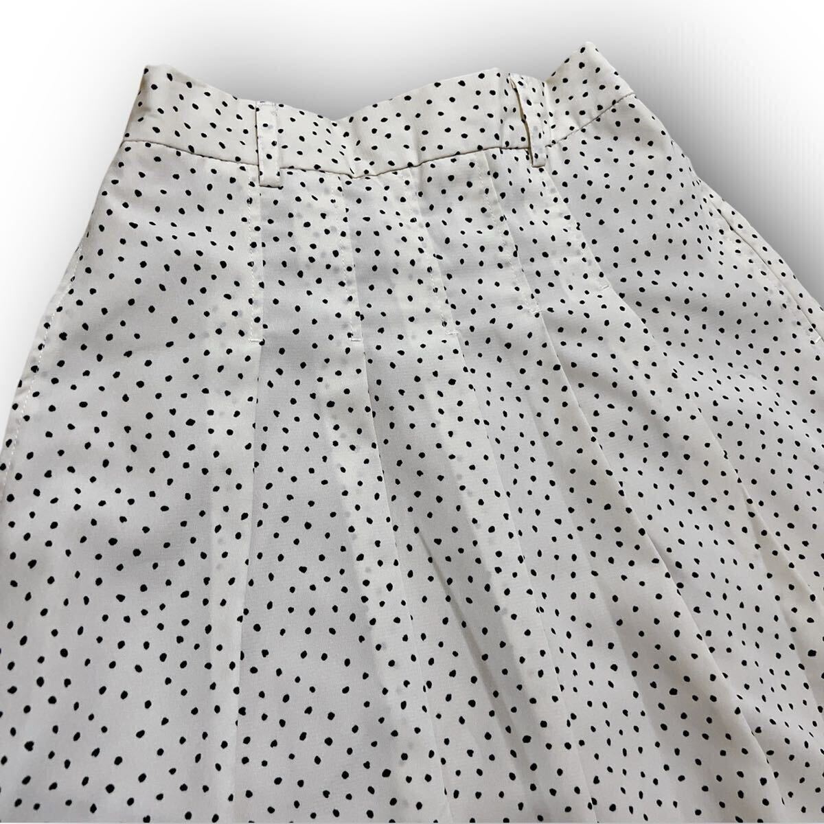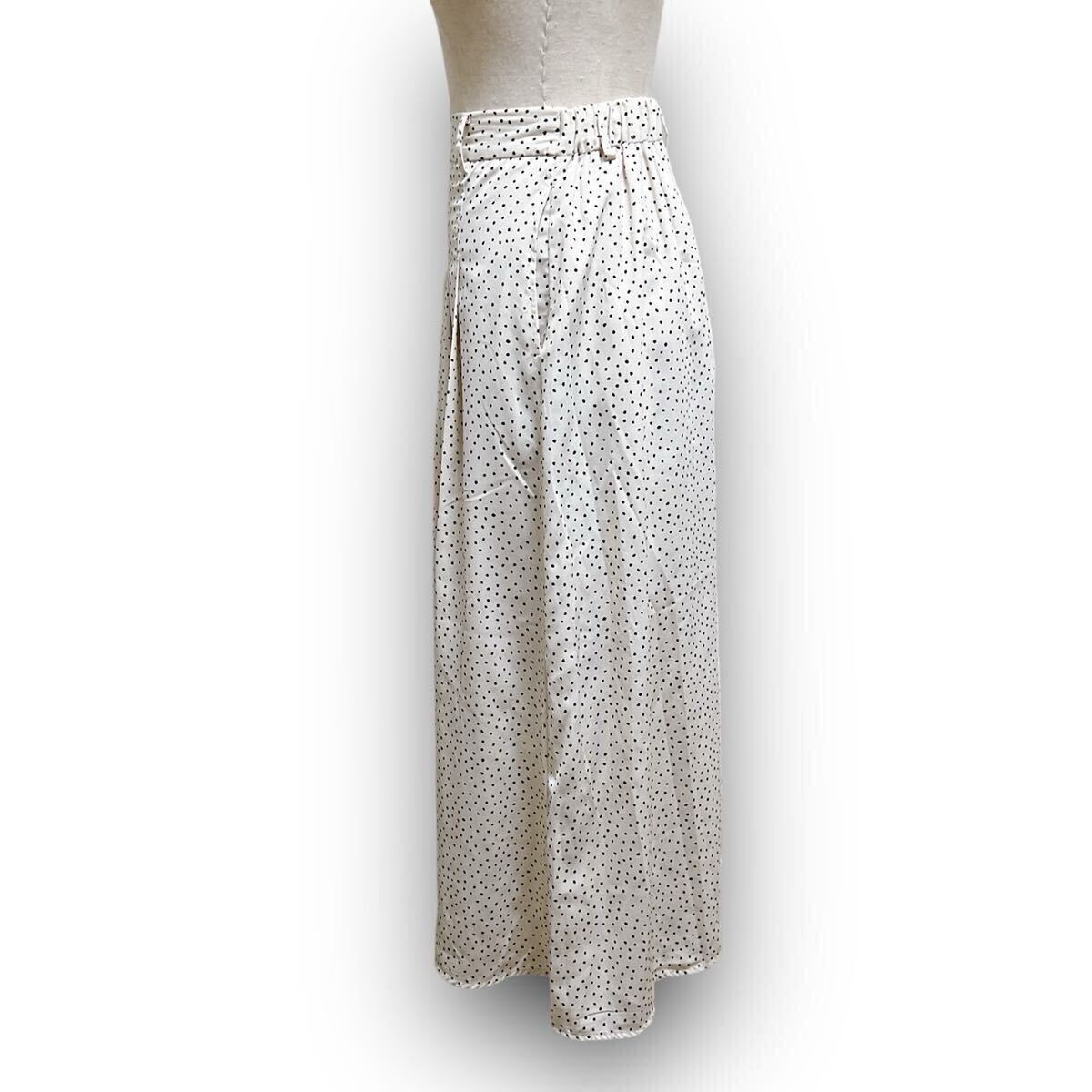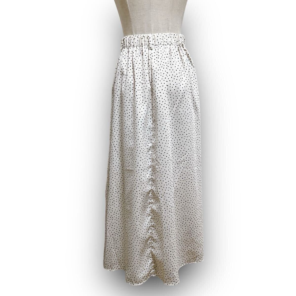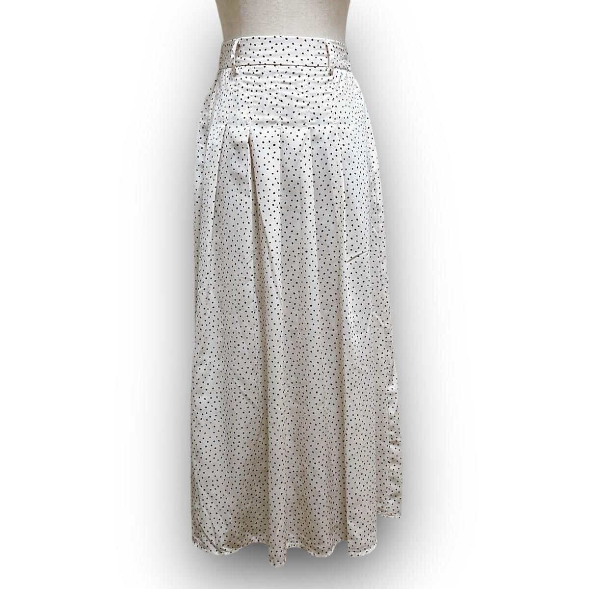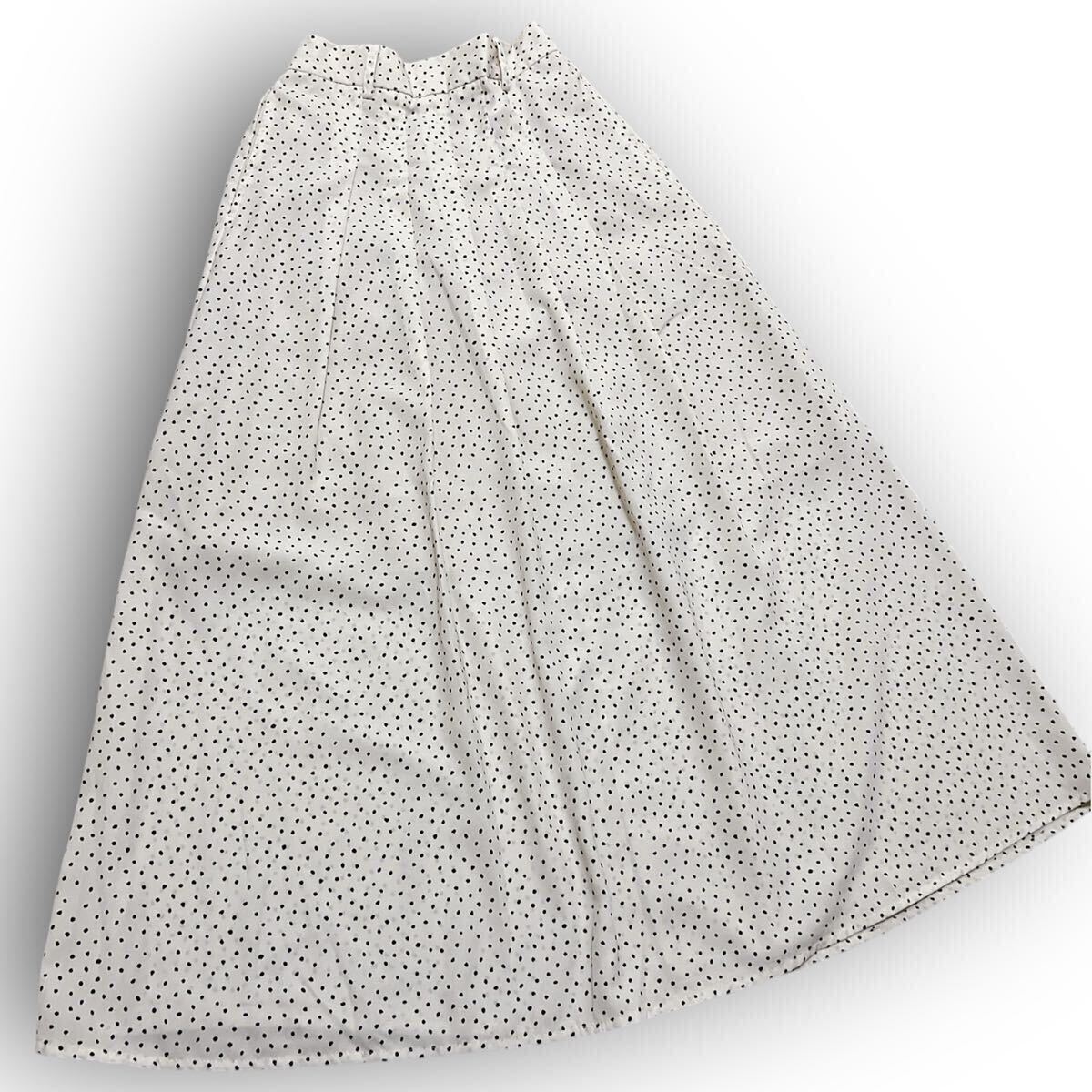 This is a beautiful polka dot pleated long skirt from GU (Japan fast fashion brand). In excellent condition, the skirt features an ivory background with small black dots. It has an elastic waistband for comfort and a flowing pleated design. The length is perfect for any season. The material is 100% polyester, making it easy to care for. Please check the measurements above for sizing details.