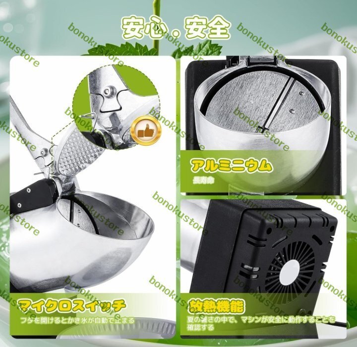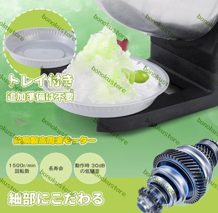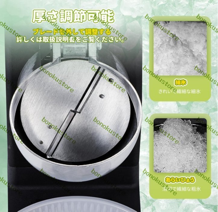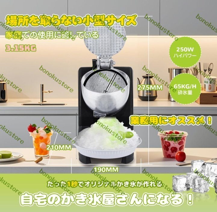 この商品について【夏に大活躍】250Wハイパワー+65kg/h砕氷量+大容量=たった1秒でオリジナルかき氷が作れます。【より小さいより簡単】275*190*210mmの小型サイズ、場所を取らず、家庭での使用に適しています。【厚さ調整可能】ブレードを外して調整できます。細かい氷も粗い
