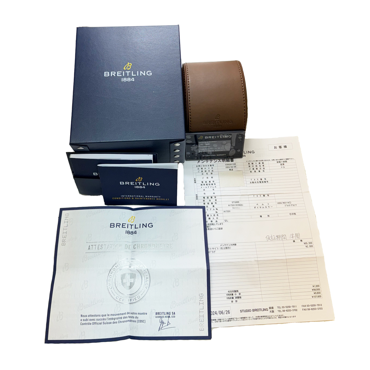 ブライトリング純正ボックス、国際保証書(2019/7/16より2年間)、取扱説明書、クロノメーター証明書、ブライトリングメンテナンス明細書(2024/6/26 メンテナンス完了日 メーカーコンプリートサービス済み 氏名、住所部分切り取りあり)