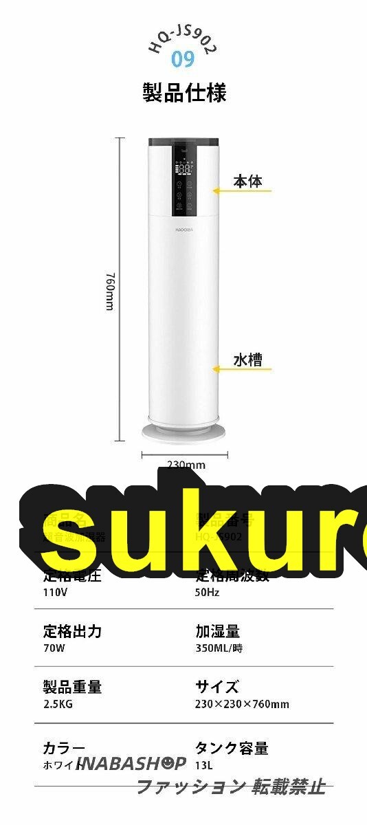 ★状態:新品未使用 【商品仕樣】 商品:超音波加湿器 消費電力:70W 重量:2.5kg 夕夕容量:13L 本体寸法:高さ760mm(台座直径230) タイマー:8段階タイマー設定 【注意事項】 製品更新により、予告なしで同じ商品がデザイン、色若干変わる場合がございます、予めご了承下さい。 撮影の為、画質等の関係上、色などが実際の商品と若干違ってしまうこともあるかもしれませんがご理解のほどご購入ください。予めご了;承ください。 更新のタイミングによっては実在庫に相違が出る場合がございます。 万が一在庫切れや入荷待ちとなる場合は別途メールにてご連絡いたします。