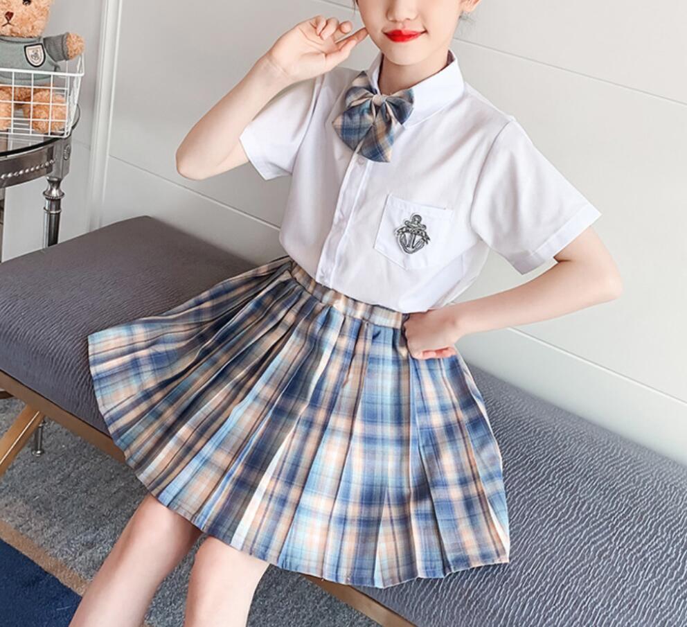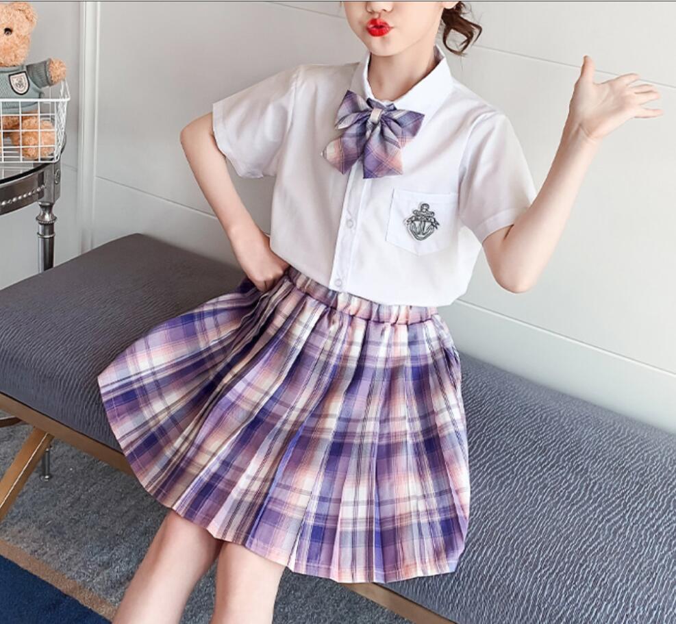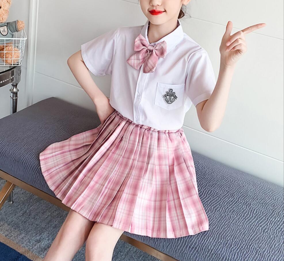 制服 2点セット セーラー服 女の子 子供服 半袖シャツ プリーツスカート チェック柄 キッズ JK制服 Aライン 学生服 リボン付~バラ色