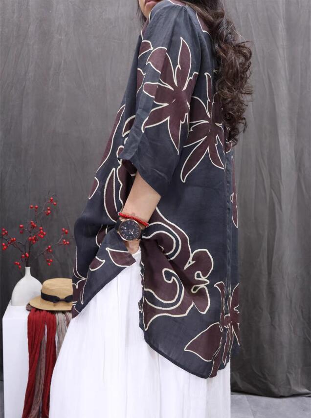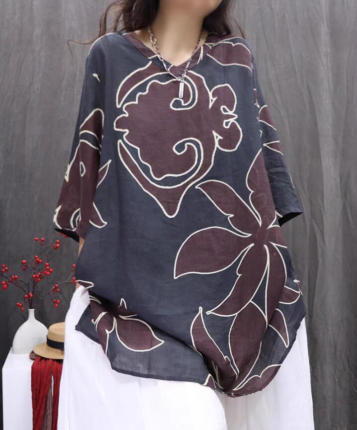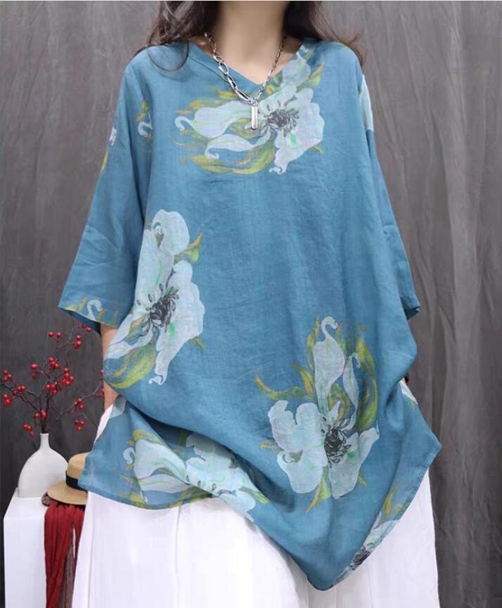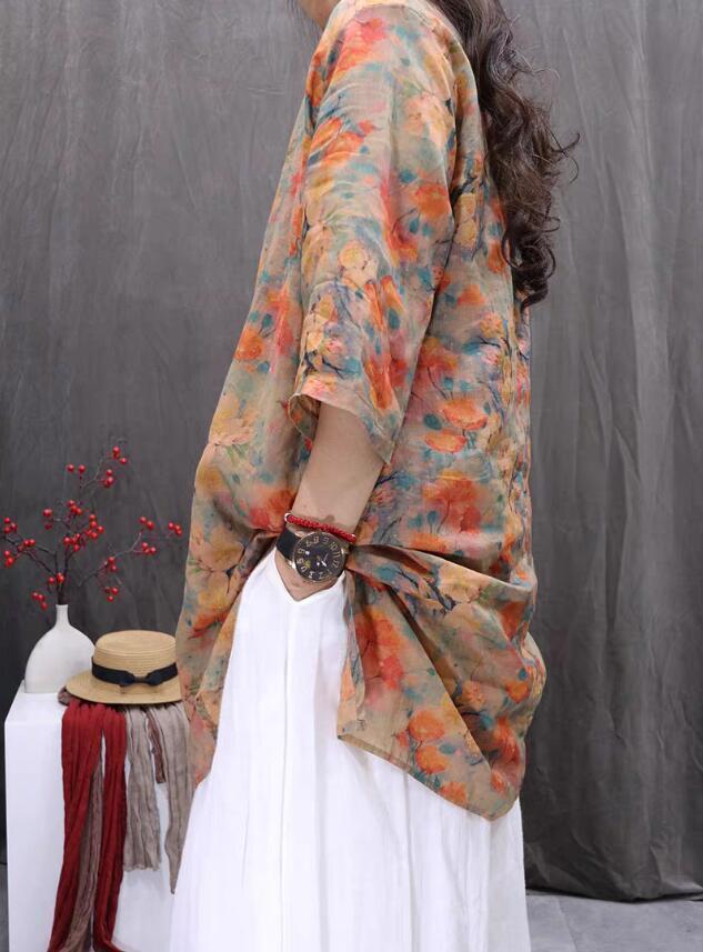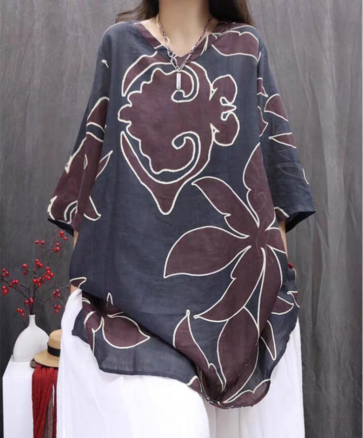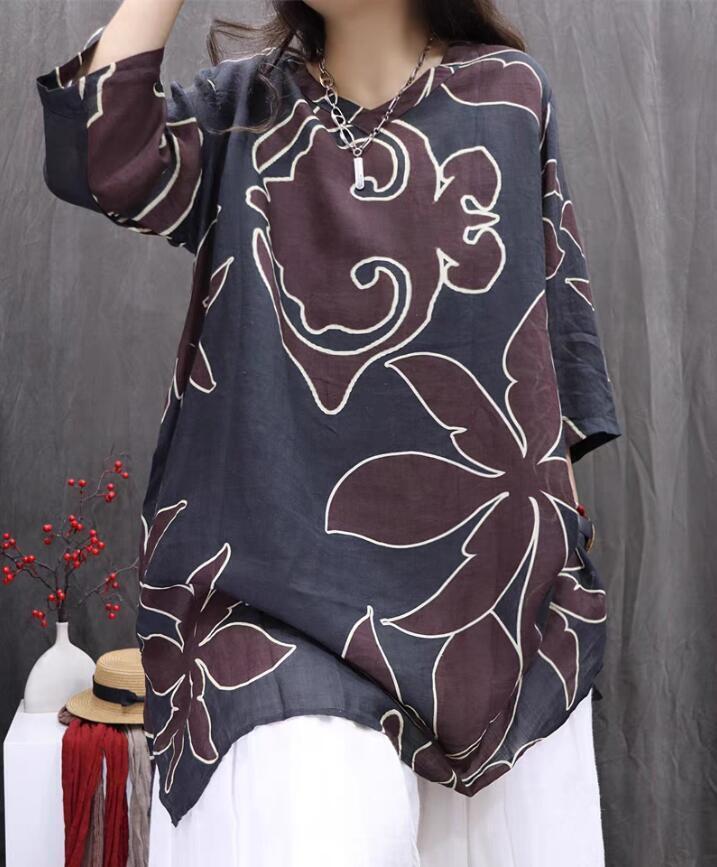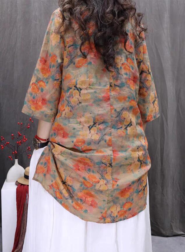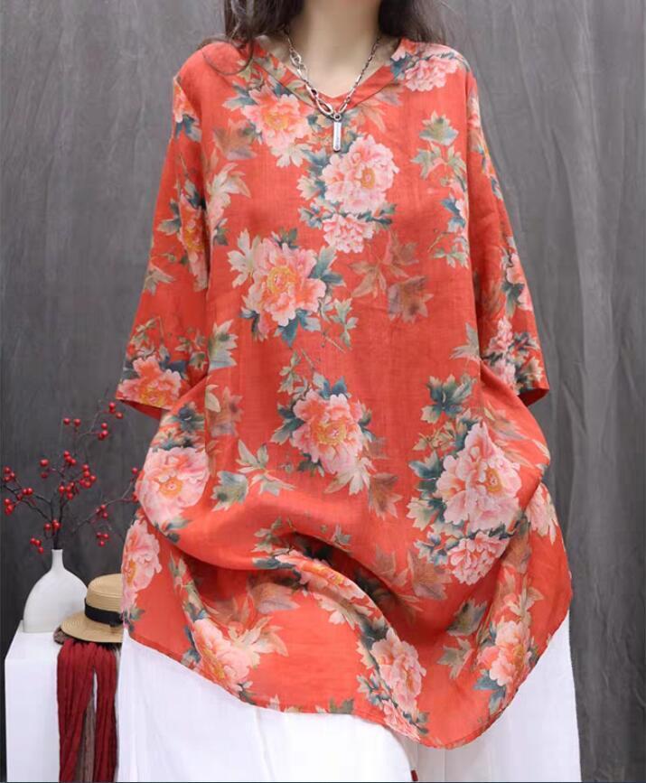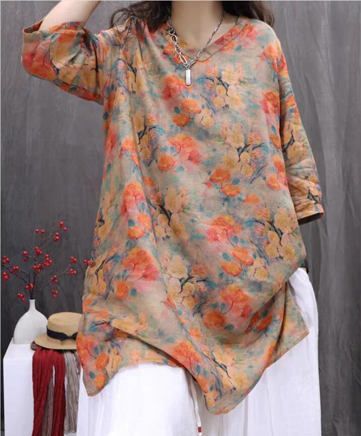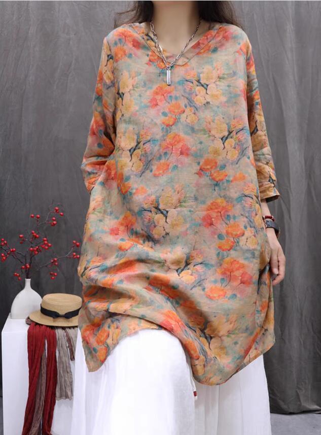 新入荷~シャツ レディース ロングシャツ トップス プリント柄 チュニック Vネック 七分袖 ナチュラル 着痩せ ゆったり ~黄