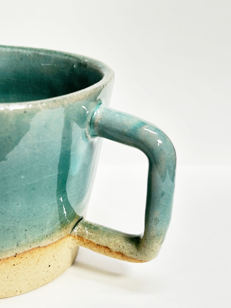 美濃焼のおしゃれでかわいいマグカップです。 大きめなのでスープカップとしてもお使い頂けます。 珈琲、コーンスープなどを入れてほっと一息、いかがでしょうか。 持ち手は素朴なナチュラル仕上げ。 珈琲を飲むのが楽しくなりそうなマグカップです。 ~注意点~ ・持ち手の部分は素焼き仕上げの為、石などが混じり、黒色等の点々が見られる場合があります。 ・陶器の裏面は、多少ざらざらとしている為、テーブルなどでは擦り傷等にご注意ください。 ・焼き具合などによって1点1点、形や色味などが多少異なります。 ご理解のほどお願いいたします。 | |||