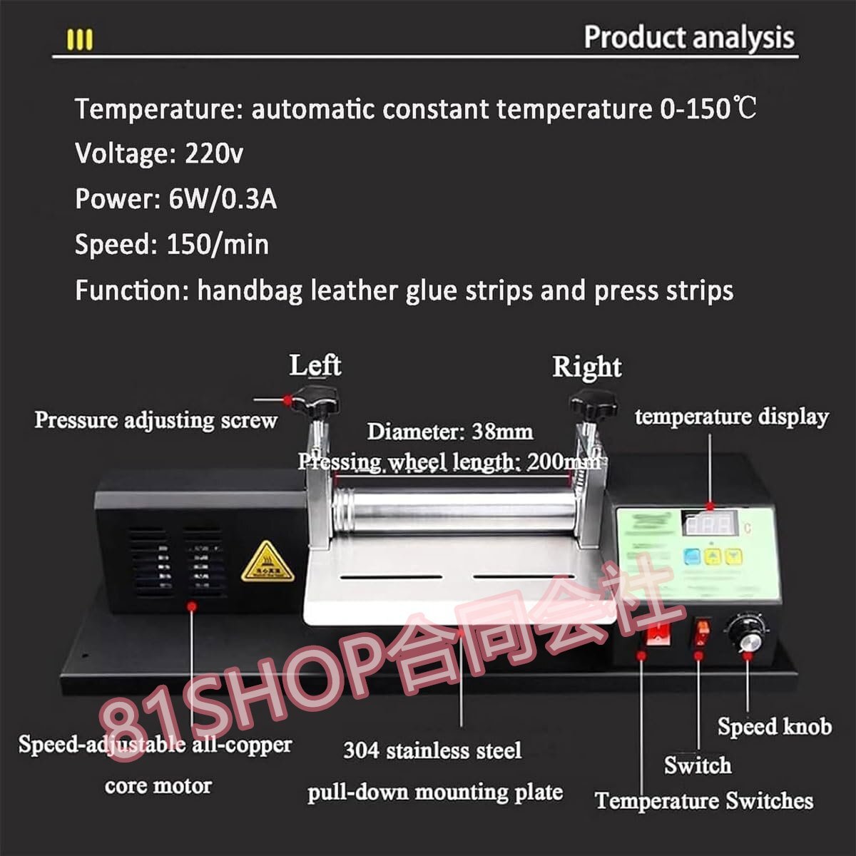 一定温度加熱:レザーストリップマシンは自動的に0~150°Cの一定温度を維持し、作業効率を迅速に向上させます。速度と圧力調整ナットは、あらゆるニーズに合わせて調整できます。