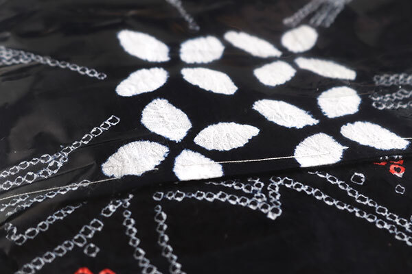 全体には白色、赤色、ピンク色で花模様が絞り染めされており、大変よいお品でございます。