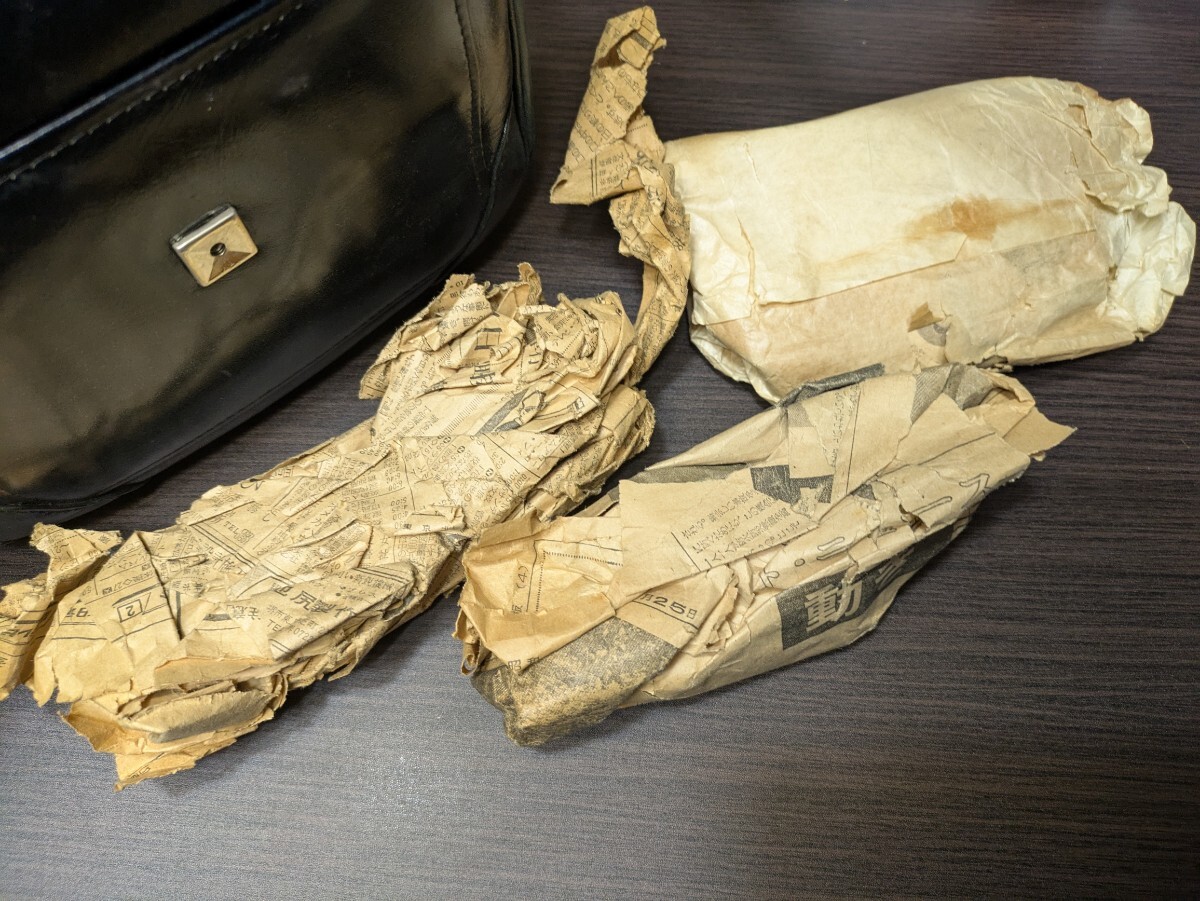 7番目の写真は型崩れ防止の為に入れている新聞(70年代)です。
