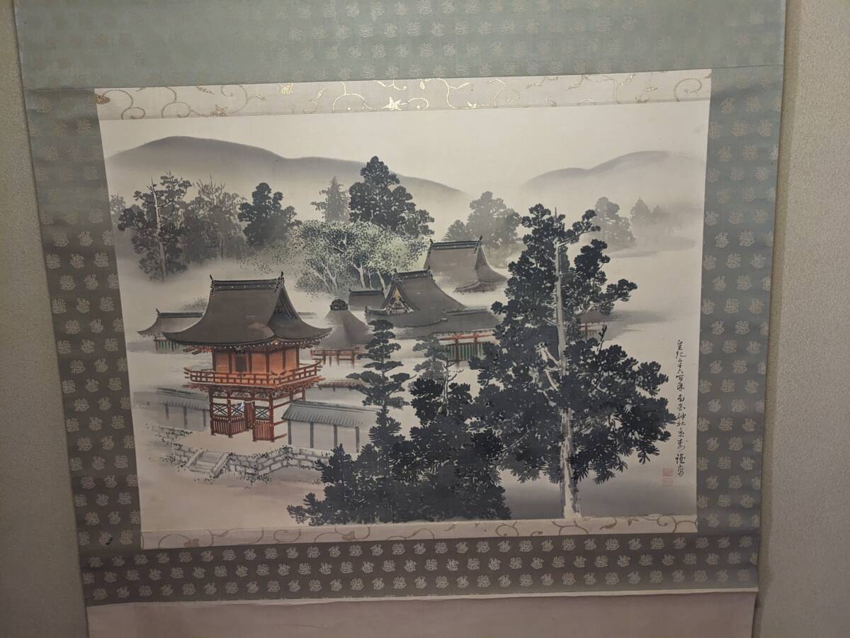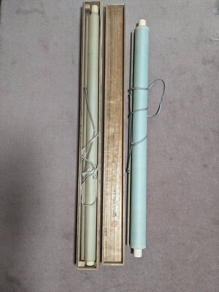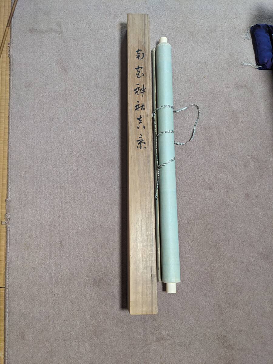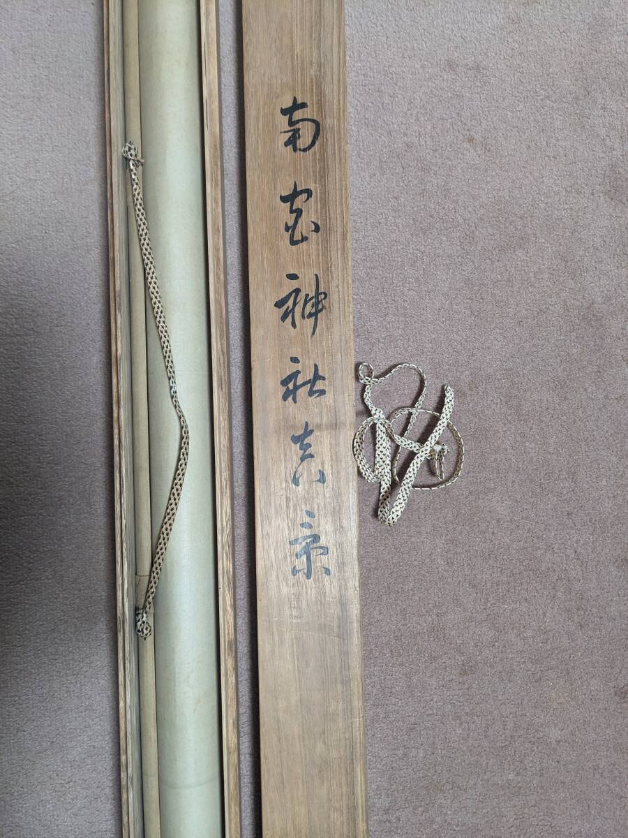 南宮大社の掛軸と萬歳々々の書の掛軸です。景寿とある南宮神社の掛軸の軸先まで含めたの横の長さは約96㎝で共箱(箱に少しイタミ有)、画像では軸をまく紐がとれていますが、つけておきました。画像のように表具に書いた線があります。書の掛軸もシワ等の経年のイタミがあります。送付は、ゆうパックを予定しています。他にも岐阜県の高木美石の掛軸を出品しております。同時送付も可能です。入札よろしくお願いします。