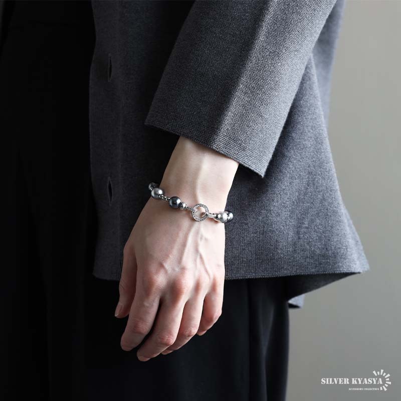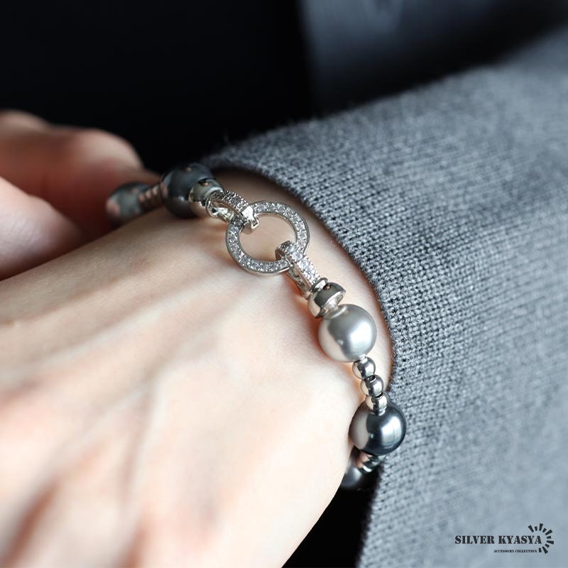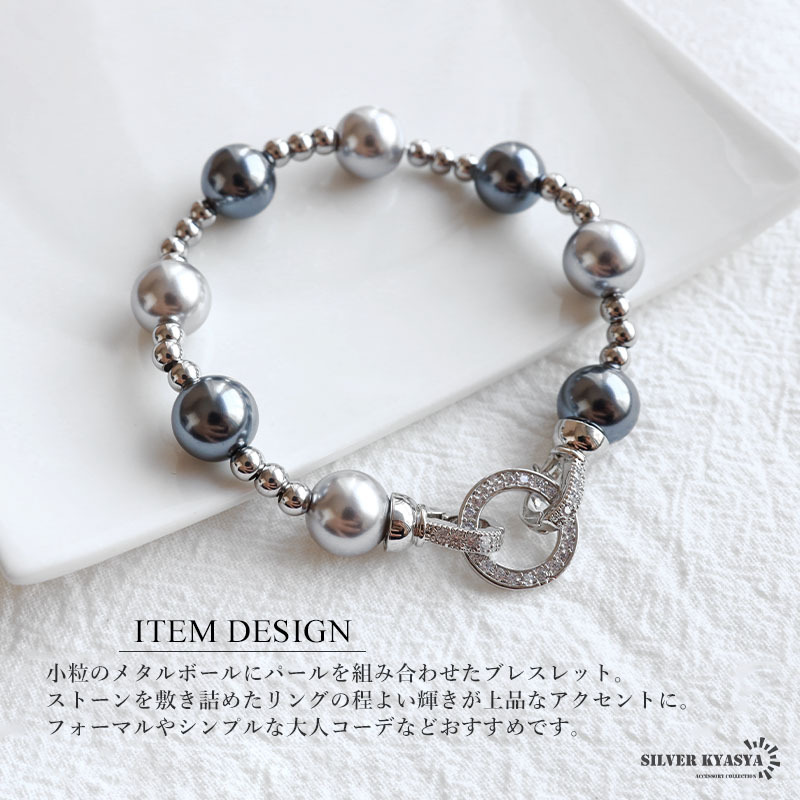 小粒のメタルボールにパールを組み合わせたブレスレット。ストーンを敷き詰めたリングの程よい輝きが上品なアクセントに。フォーマルやシンプルな大人コーデなどおすすめです。