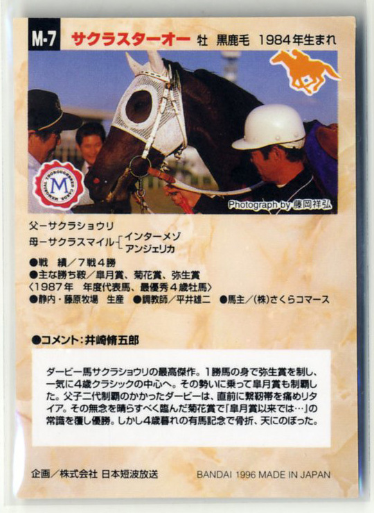 | ★サクラスターオー M-7 メモリアルカード サラブレッドカード 95年版 東信二 皐月賞 菊花賞 年度代表馬 奇跡と悲劇の二冠馬 写真 画像 競馬カード | |