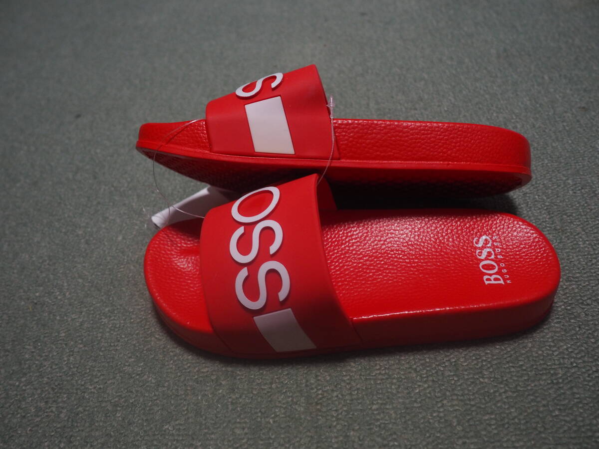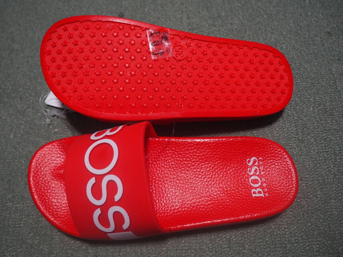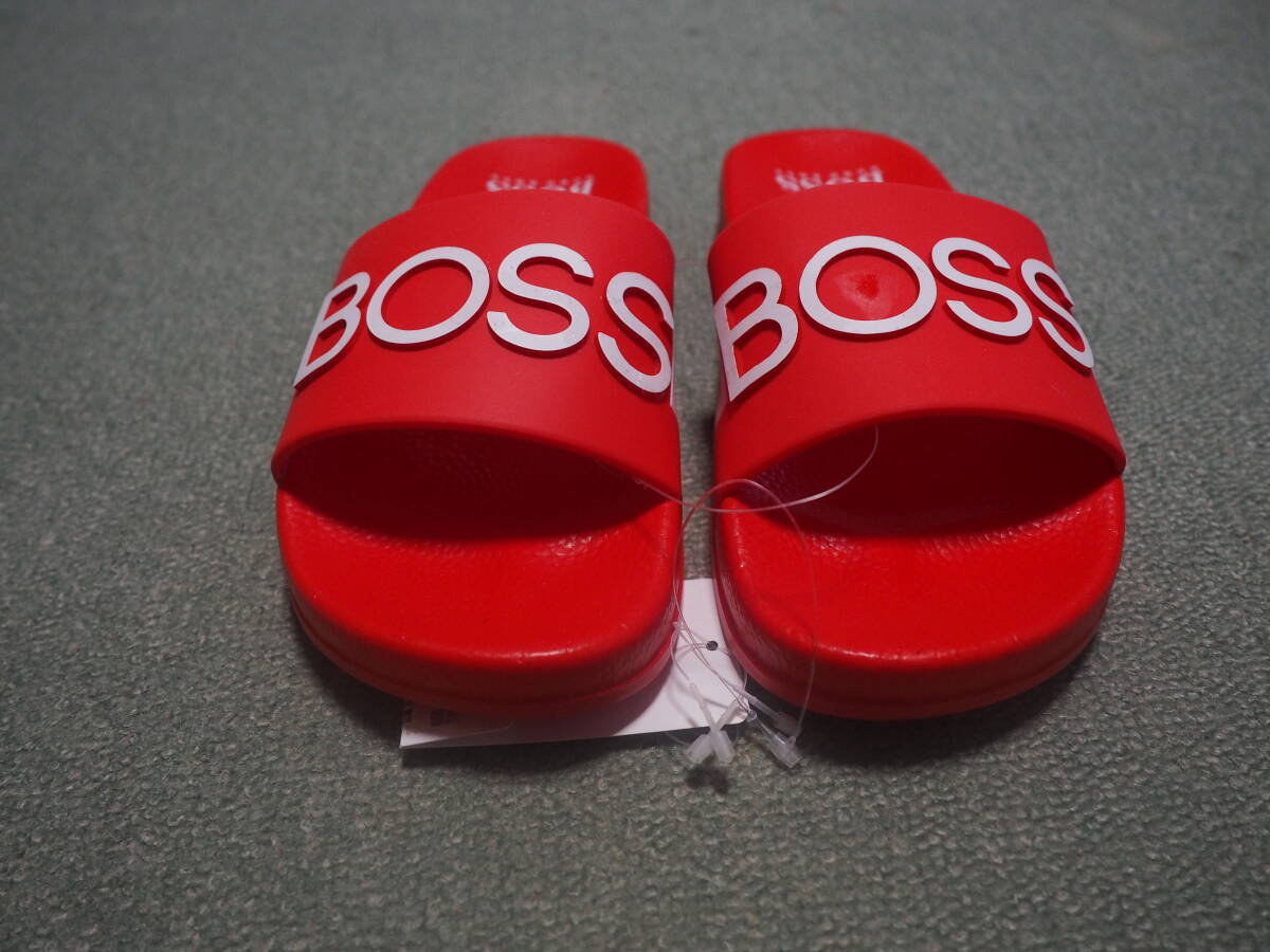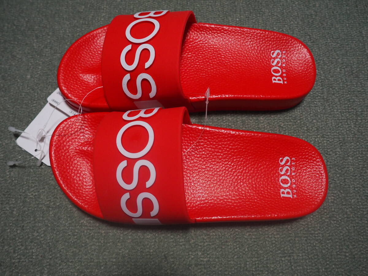 未使用保管品 HUGO BOSS ヒューゴボス キッズスライドサンダルロゴアッパーレッド系;サイズEU35 10歳程度ですサV>サイズ標示35;素人寸約長さ23㎝最大幅9㎝