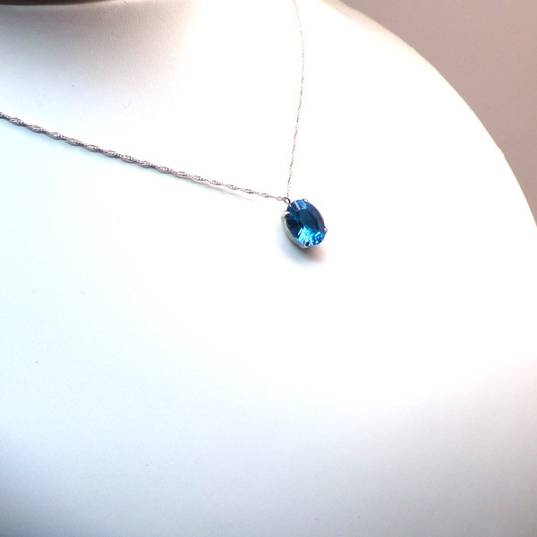 深みのあるミッドナイトブルー、繊細なカットを施した彩度の高いオーバルシェイプのロンドンブルートパーズをホワイトゴールドの枠にセット。上品なネックレスです。