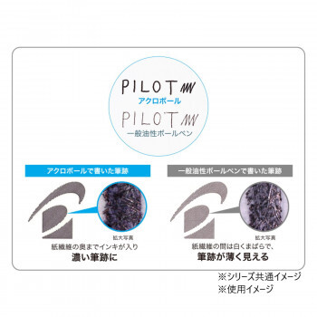 | アクロインキ搭載高級油性ボールペンです。アクロボールに使用しているアクロインキは、粘度を一般的な油性ボールペンの1/5にすることで、水性に近いサラサラなインキになり、ボールがスムーズに回ります。アクロインキは粘度が低いので、ペン先へのインキ供給が潤沢に。紙繊維の奥までインキが入り込むので、ムラのない濃い筆跡になります。 |