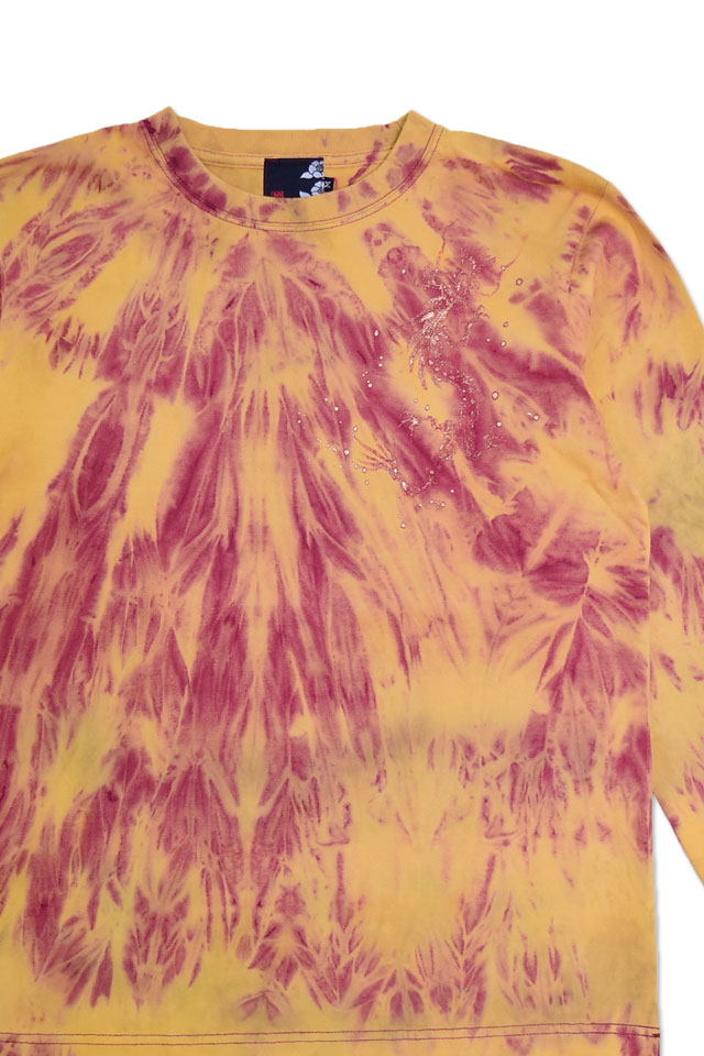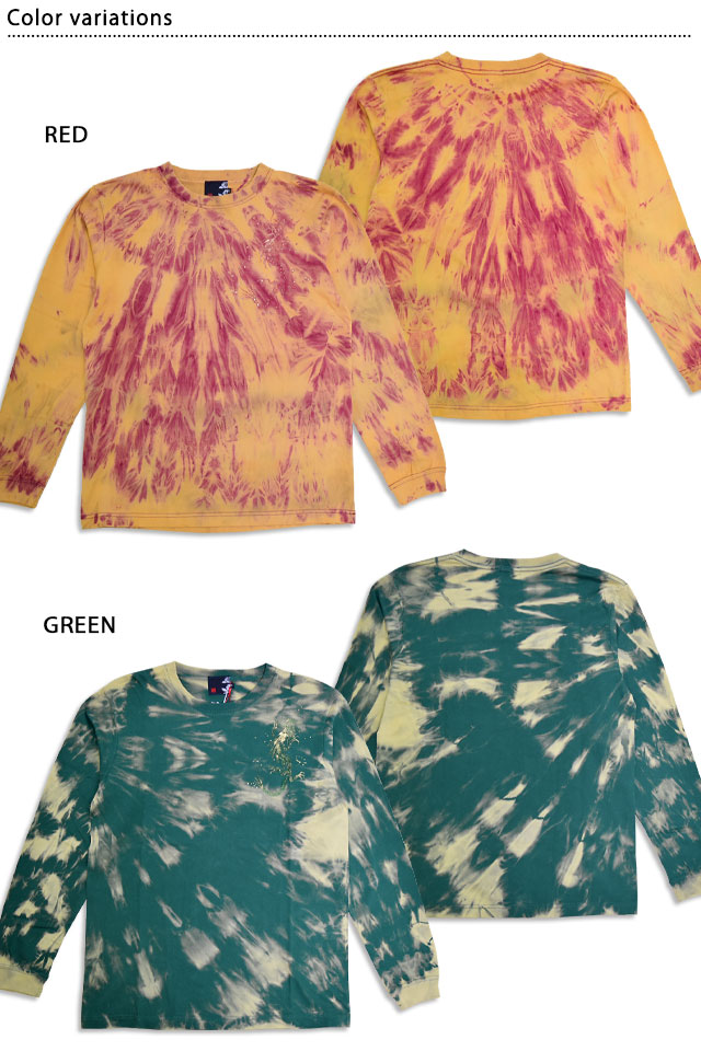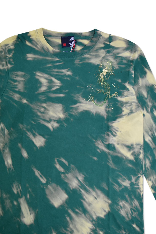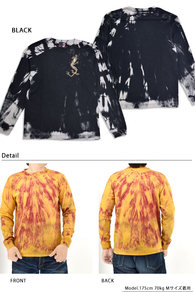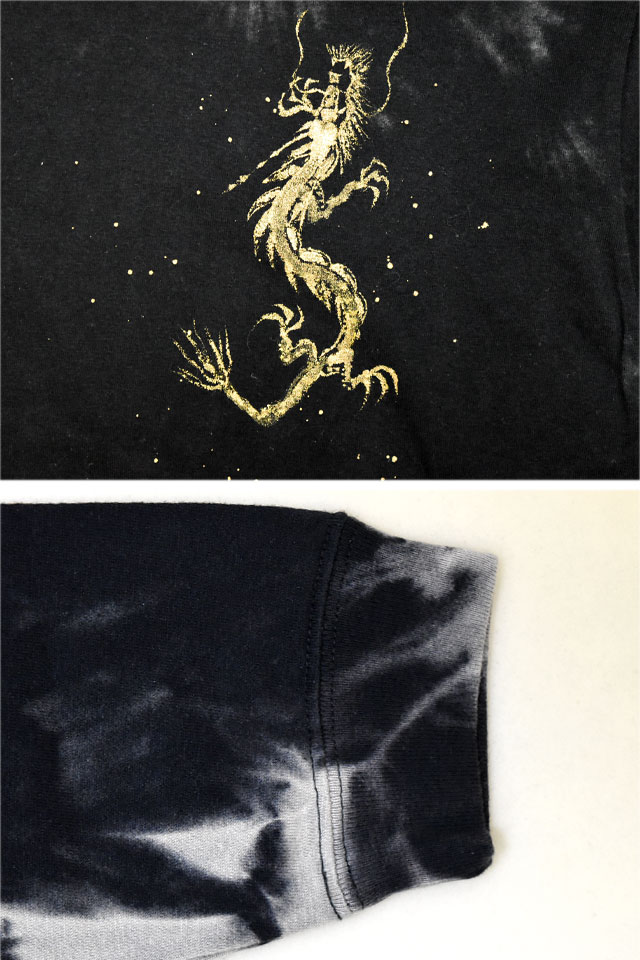 この道40年以上の「ぬれ描き友禅作家・碧三」が魅せる上品で繊細さが特徴の碧(あお)より「金龍 籠抜染ロングTシャツ」のご紹介です。 ボディーにムラ染め風の加工を施した長袖Tシャツに手描きを組み合わせました。 フロント左身頃には金の龍をデザイン。 染めと手描きの組み合わせが絶妙な仕上がりとなっております。 ボディーには、綿100%のさらりとした肌触りのTシャツ生地を採用。 袖にはリブを縫い付け、野暮ったさを軽減しました。 | ||||||||||||||||