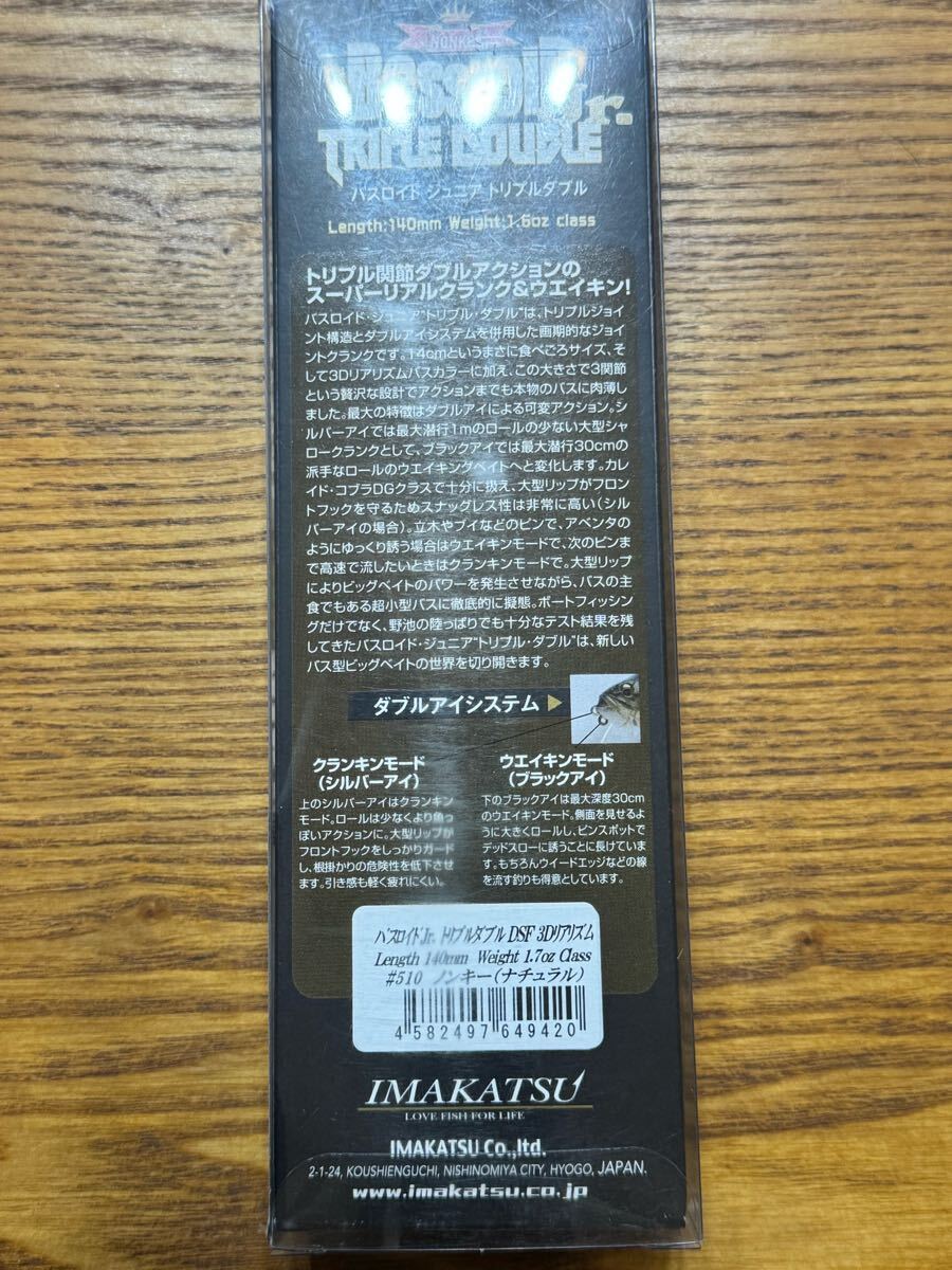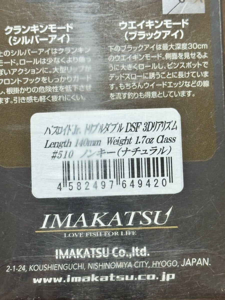 こちらはイマカツなバスロイドJr トリプルダブル デッドスローフローティング 3DR #510ノンキー (ナチュラル)になります。未開封未使用品です。
