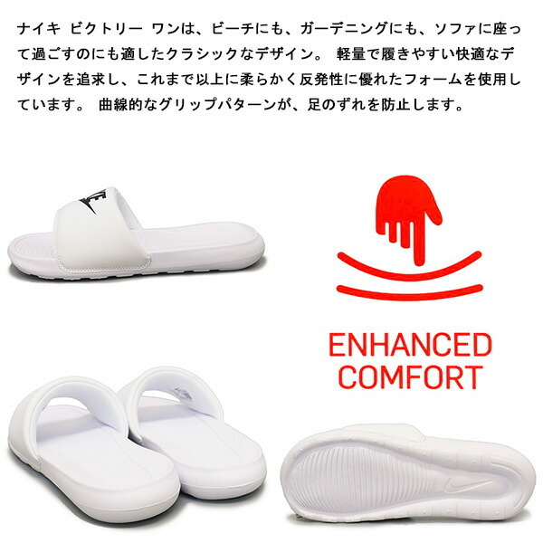 | スペック | ナイキ ビクトリー ワンは、ビーチにも、ガーデニングにも、ソファに座って過ごすのにも適したクラシックなデザイン。 軽量で履きやすい快適なデザインを追求し、これまで以上に柔らかく反発性に優れたフォームを使用しています。 曲線的なグリップパターンが、足のずれを防止します。 |