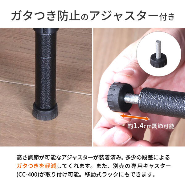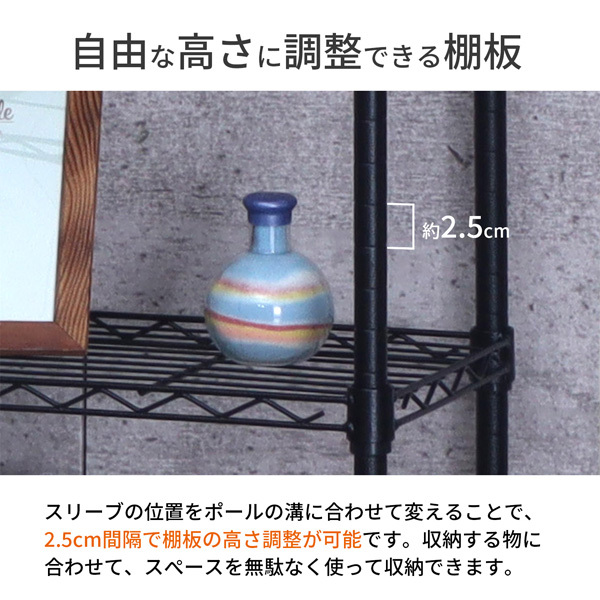 ●ヴィンテージスタイルのスチールラック NEROシリーズの支柱径19mmスチールラック●シボ加工を施したヴィンテージな質感が魅力のNEROシリーズ。●シンプルなデザインで、どのタイプの部屋にもコーディネートしやすいマットなブラック色がおしゃれ。●スチール製ながら、軽量なので、持ち運びも簡単にできます。●棚板1枚あたりの耐荷重は40kgあり、家電や調理器具、食品なども安心して収納することができます。●奥行25cmのスリムタイプ。●キッチンやリビング、クローゼットやガレージなど様々なシーンで大活躍!●アジャスターが付いているので、設置する際のガタつきを微調整することができます。●スリーブを柱にはめ込み棚板を固定するだけで、簡単に組み立てられます。使いたい高さの位置で4本の支柱の溝に線を書き込み、上下の向きに注意しながら線の位置にスリーブを取り付け、下の段から棚を一つずつ差し込み固定していきます。※スリーブ同士の間に若干の隙間が生じますが、破損防止や取外しの際に必要な隙間です。お客様組み立て商品です。棚板をセットする際、ゴムハンマーなど軽くたたいてください。●送料無料:(沖縄・離島/別途お見積もり)家具は重量がありますので、配達中などのアクシデントがゼロではありません。その場合は迅速に交換いたします。