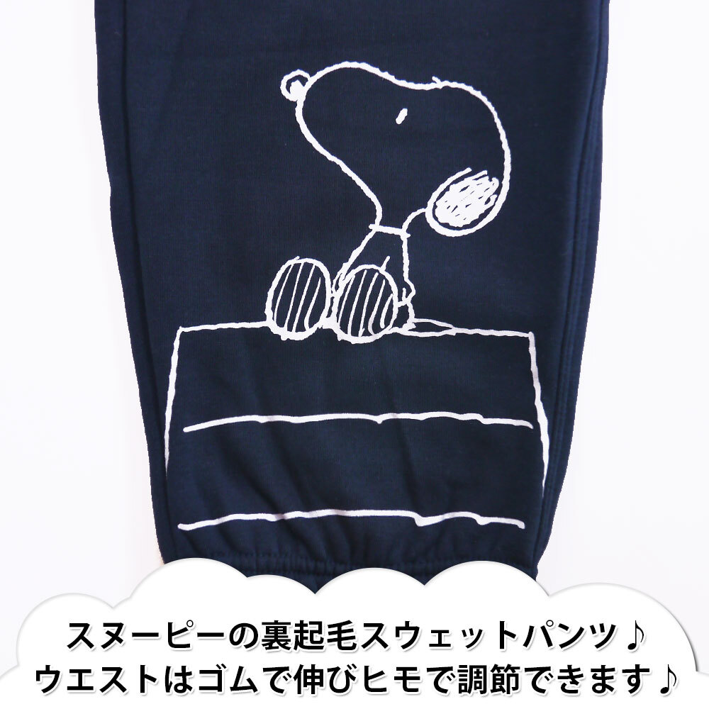 正規店仕入れの新品未使用品です 綿とポリエステル素材で、吸汗速乾に優れます スヌーピーの裏起毛スウェットパンツ ウエストはゴムで伸びヒモで調節できます |