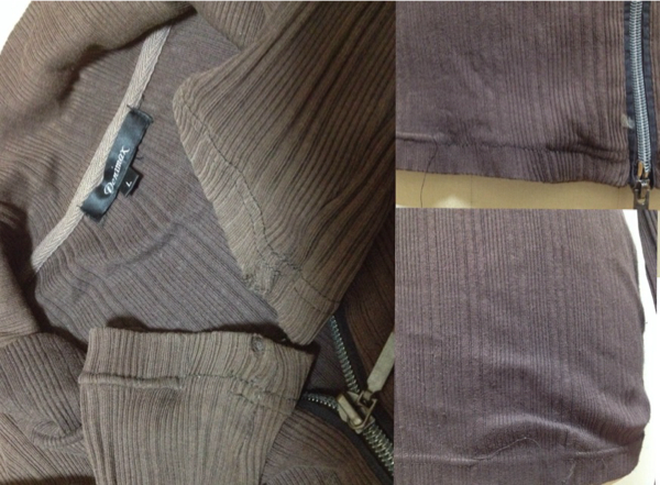 袖口な穴あり、フロントジッパー下に汚れ、裾にミシン糸のほつれ2カ所あります。