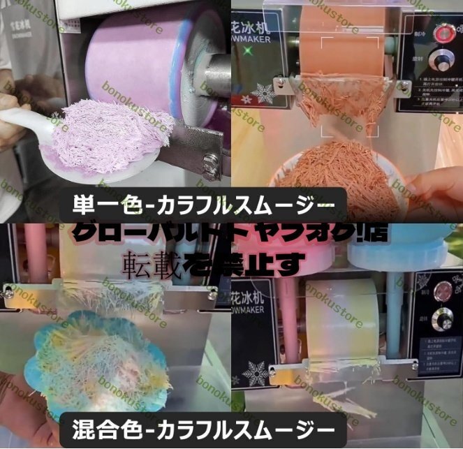 ***【単一色/混合色製作可能】ユニークなのは、色を混合するマシンを選択して、顧客にとってより魅力的なグラデーションカラーのスムージーを作成できることです。***【製品の選択】124FD/164FD は混合色のスムージーの作成をサポートしますが、124F は 4 つのバケツの 1 つをボタンで制御して水を放出することで単色のスムージーを作成できます。***【124FD/164FD -----混合色】4 つのバケツ (a/b/c/d) の底はバッフルで塞がれています。a と c の混合色のスムージーを作りたい場合は、a と c のバッフルを開けます。***【124F----単一色】この製品は、スマートボタンによって制御されます。4つのバレルは、コントロールインターフェイスの4つのボタンに対応しており、4つの味の原料を事前に準備し、顧客のニーズに応じて異なるボタンを選択できます。製品製造: この機械は、スノーアイス、ボルネオール、スパゲッティ、ウォーターフォールの4種類のアイスクリームを製造できます。その他: 成分の濃度が異なり、機械のドラム速度が異なると、異なる効果を持つ製品が生成されます。フレーク、スムージー、アイスクリーム、ミルクシェイク、ヨーグルトアイシング、その他のおいしいフローズンデザートを作るのに最適です。牛乳、ジュース、コーヒー、ビール、ワイン、または他のフレーバージュースをベースとして使用できます。刻んだフルーツ、ジュースシロップ、チョコレート、アイスクリーム、コンデンスミルク、小豆、ナッツ、タピオカミルクティー、サゴなどの甘いトッピングを自分で作ることができます。ミルクティーショップ、カフェ、タイ料理レストラン、寿司屋、バー、ホテル、アイスクリームショップ、ショッピングモール、学校、屋台、フードトラックなどで広く使用されています。自宅、パーティー、イベントなどで自分だけのドリンクを作りましょう。