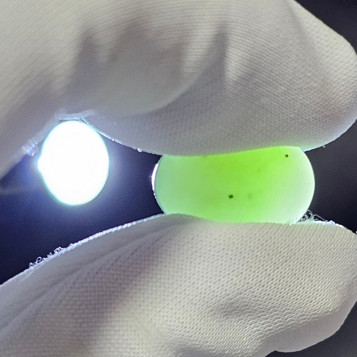 ◇その他:最上級品です。日高翡翠特有の抹茶色の斑点もありつつ、素晴らしい透明感をもった、まさに博物館級の代物です。日高翡翠は色々な模様や透明感のものがありますが、ここまで高い品質の物となると、業者でもなかなかお目にかかれないレベルの一品だと思いです。