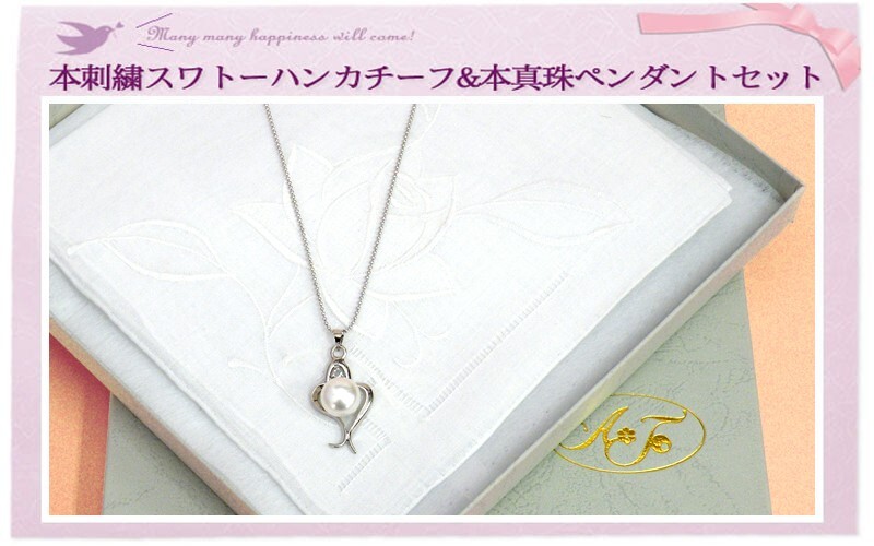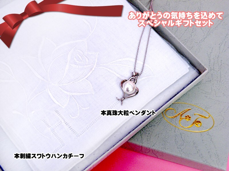 【Wの喜び♪】【送料無料】 どこにもない!アリススペシャルギフトセット☆ 商品は全てまとめて専用ケースにセットし、可愛いラッピングでお包みして、お届けいたします。きっと、大切な方にもお喜び頂ける間違いなしです!スワトーハンカチ―フ 綿(コットン)100% サイズ約300mm×300mm 正方形 カラー:ホワイトハンドメイド商品ですので、写真と実際の商品は、色味や模様などが若干異なる場合があります。予めご了承くださいペンダント:大粒淡水本真珠 約9mm チェーン長さ約41cm 留め具:シルバー925 モチーフ約3cm×2cm 台座は合金 テリ・キズA真珠は天然の素材ですので、画像と異なる場合があります。ご了承ください。☆ラッピング包装してお届けします。