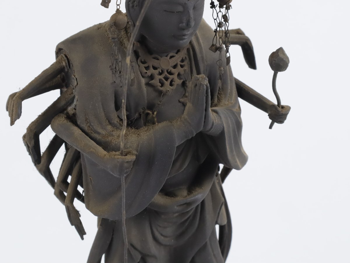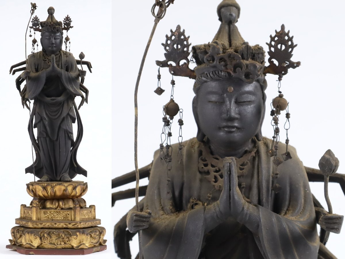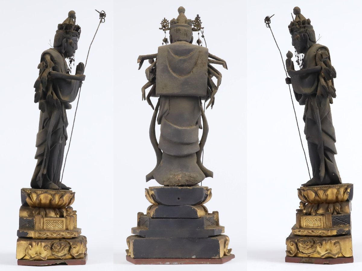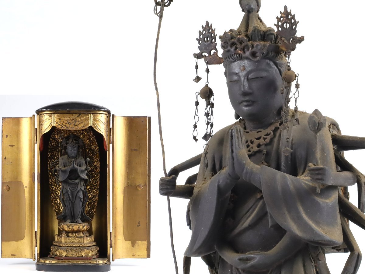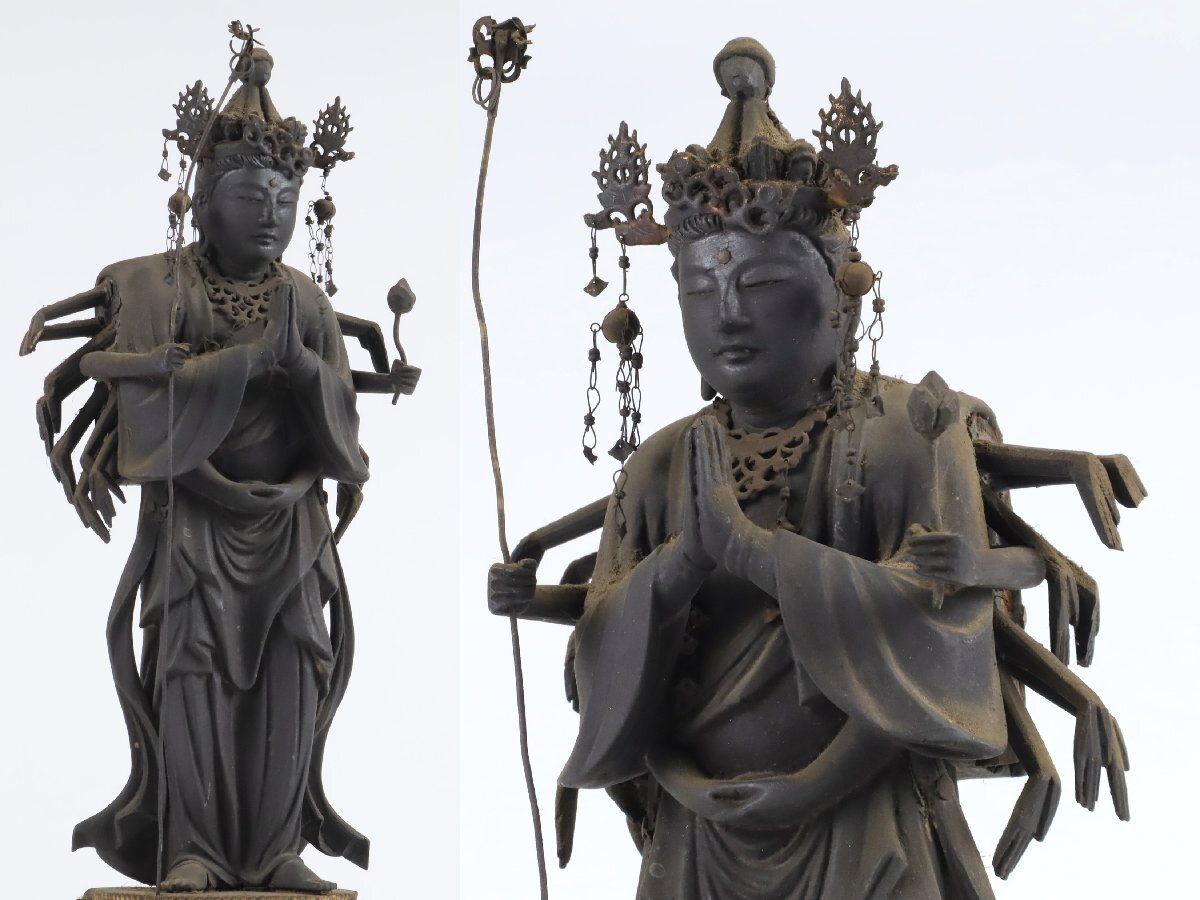【商品名】 時代 仏像 木彫 千手観音菩薩立像 厨子 密教 仏教美術 オブジェ 【状態】 経年によるキズやヨゴレ、イタミ、ヒビ、割れ、欠け、破損、剥落がございます。 腕の付け根などが弱っておりグラつきます。輸送中の振動などで破損が起こる可能性がございますので、予めご了承ください。 埃の付着などがございますが、剥落などが広がる可能性がございますので、多少のクリーニングしか行っておりません。 時代や産地、作者の記載がある商品に関しては当店での判断によるものですので、保証はいたしかねます。あくまで参考程度とお考えいただき、画像による判断をお願い致します。 上記を含む商品の状態や詳細(材質等)を写真にてご確認いただき、納得された上での入札をお待ちしております。 【大きさ】 厨子 高さ:約 38.5cm 幅:約 18cm 奥行:約 13.4cm 観音 高さ:約 19cm 幅:約 12.1cm 奥行:約 7.5cm (採寸につきましては多少の誤差があるかと思いますので、予めご了承ください。) |