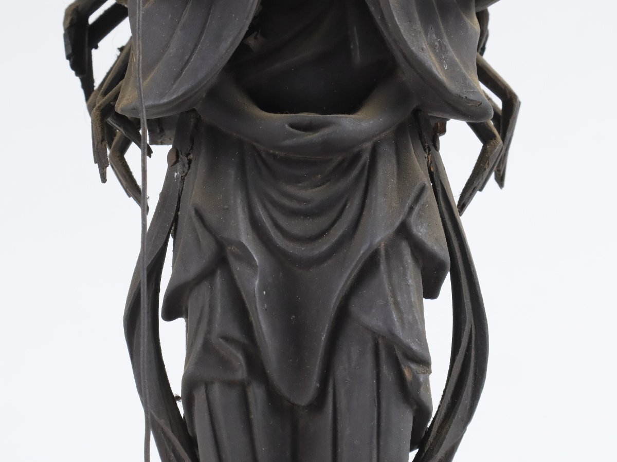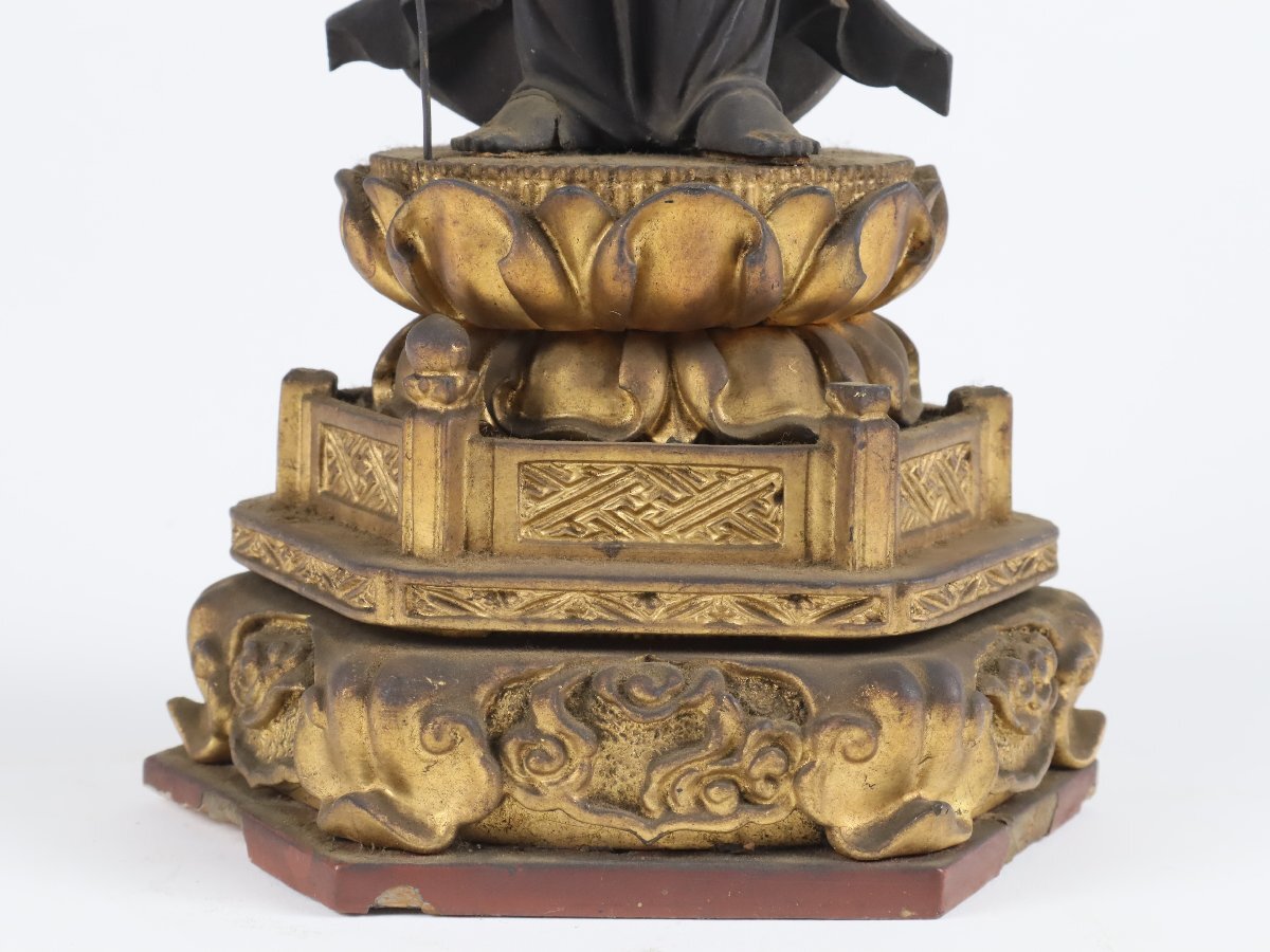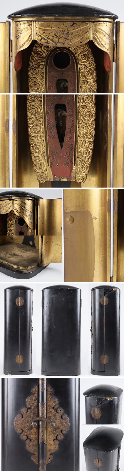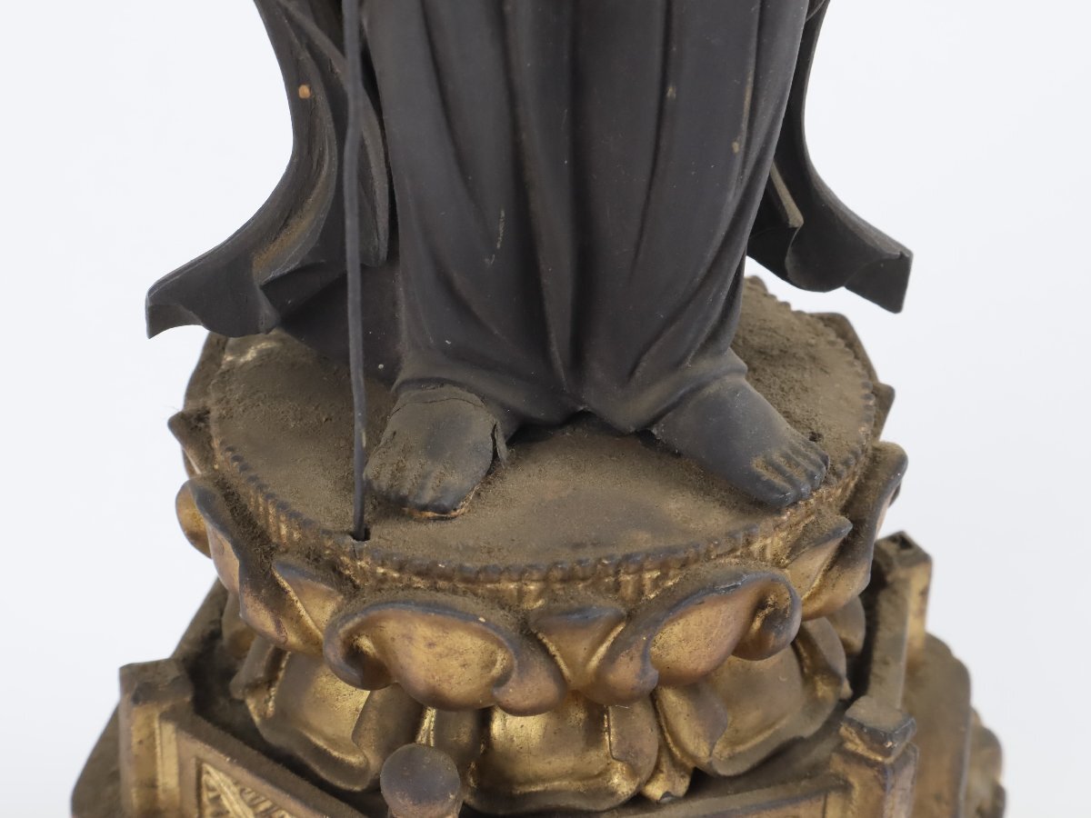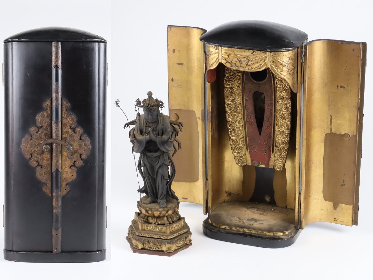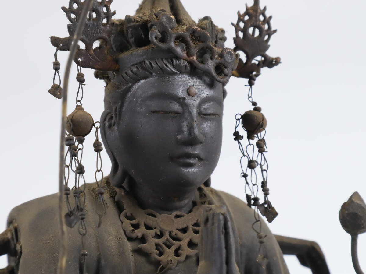 【商品名】 時代 仏像 木彫 千手観音菩薩立像 厨子 密教 仏教美術 オブジェ 【状態】 経年によるキズやヨゴレ、イタミ、ヒビ、割れ、欠け、破損、剥落がございます。 腕の付け根などが弱っておりグラつきます。輸送中の振動などで破損が起こる可能性がございますので、予めご了承ください。 埃の付着などがございますが、剥落などが広がる可能性がございますので、多少のクリーニングしか行っておりません。 時代や産地、作者の記載がある商品に関しては当店での判断によるものですので、保証はいたしかねます。あくまで参考程度とお考えいただき、画像による判断をお願い致します。 上記を含む商品の状態や詳細(材質等)を写真にてご確認いただき、納得された上での入札をお待ちしております。 【大きさ】 厨子 高さ:約 38.5cm 幅:約 18cm 奥行:約 13.4cm 観音 高さ:約 19cm 幅:約 12.1cm 奥行:約 7.5cm (採寸につきましては多少の誤差があるかと思いますので、予めご了承ください。) |
