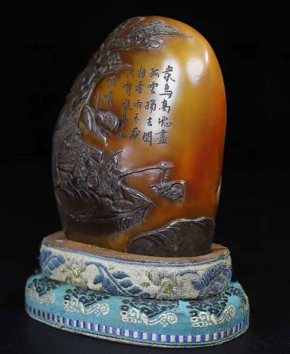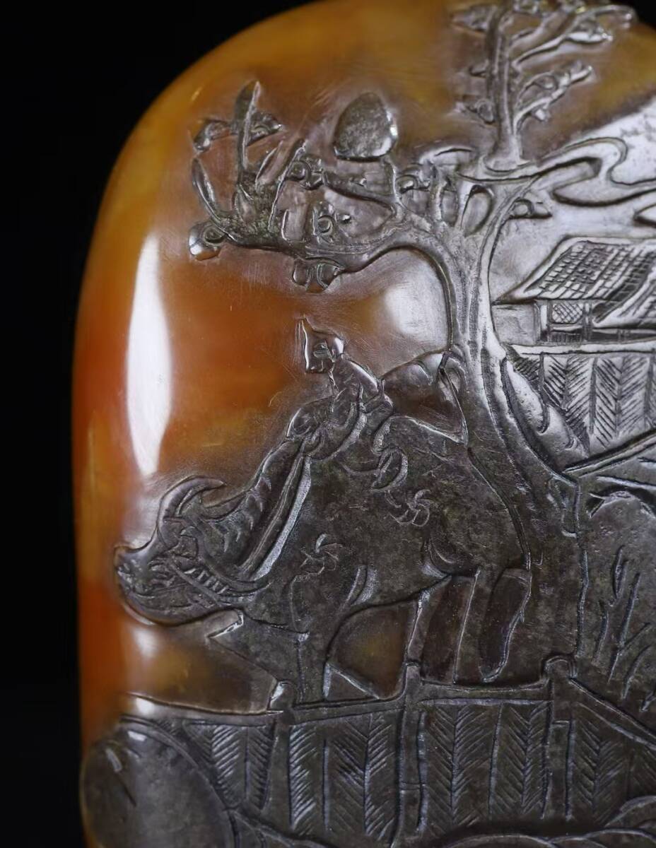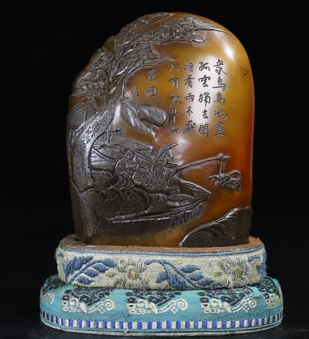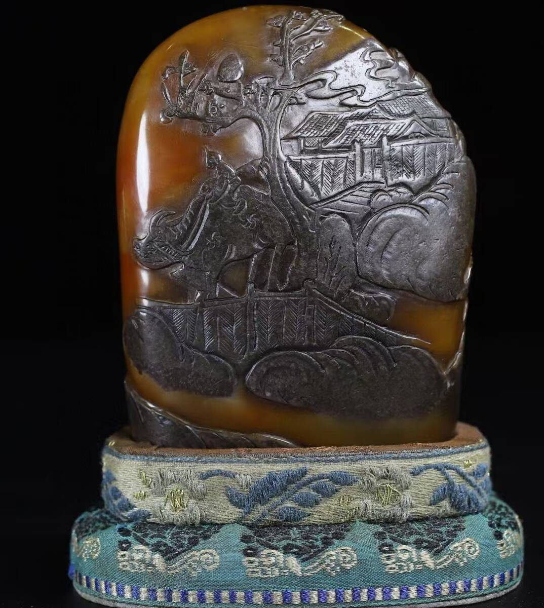 秘藏 清代 カラス皮寿山石スタンプ。『唐詩山水人物』 印章 印鑒 古印材 唐物 古玉彫 天然石 稀少珍品 古美術 古賞物 置物 旧蔵 6.17