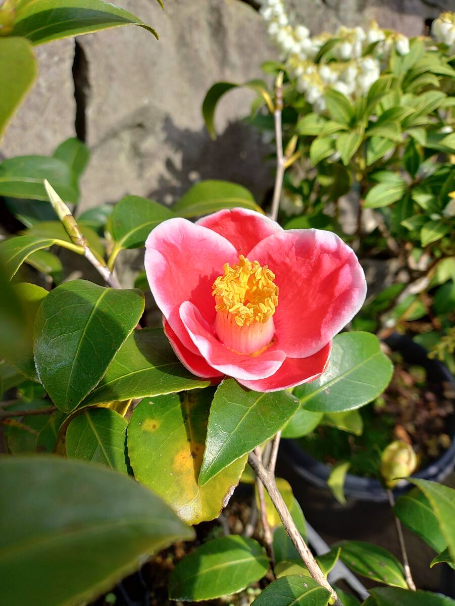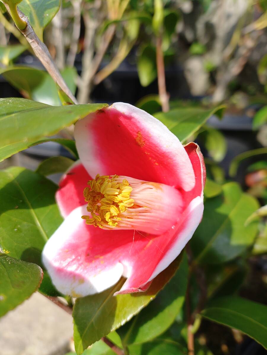 赤い花びらを白く縁取った、五島が世界に誇る幻の椿 ’玉之浦’。