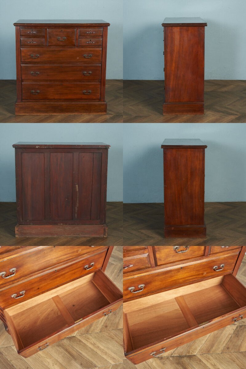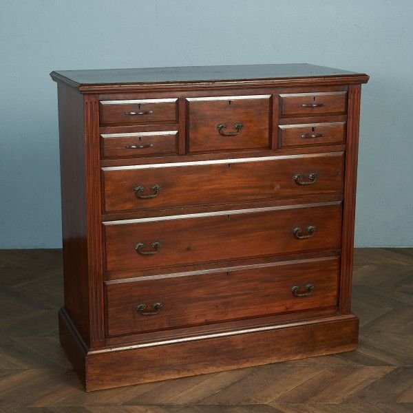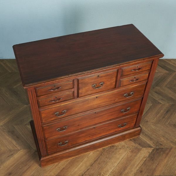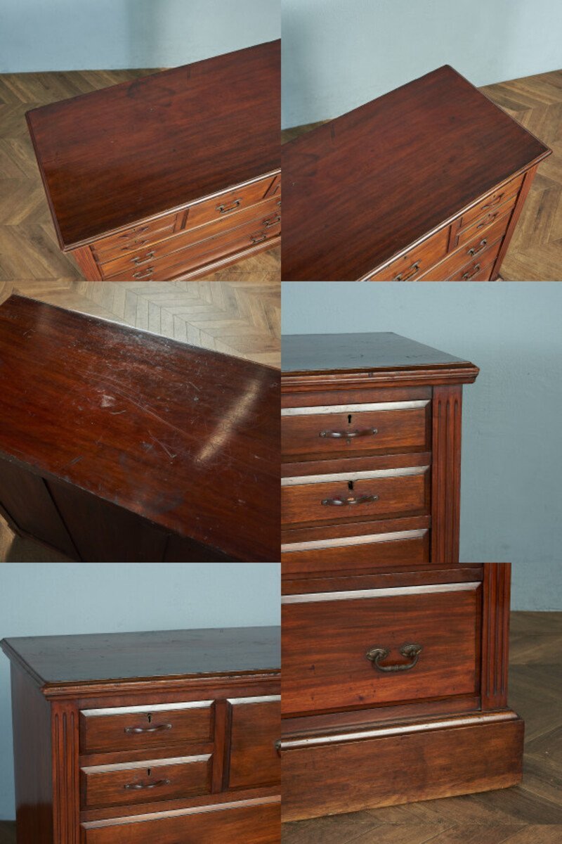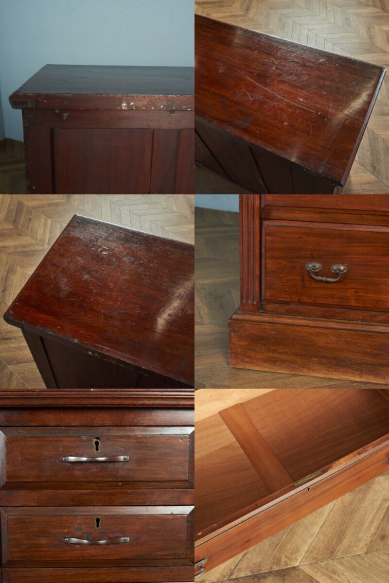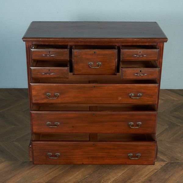 ウォールナット材を使用した、英国アンティーク チェストです。 年季を経た木肌の風合いがアンティークならではの存在感を放つ一品。実用性を重視したデザインに、取っ手金具がアクセントを添えるシンプルながらも存在感のあるお品です。 |