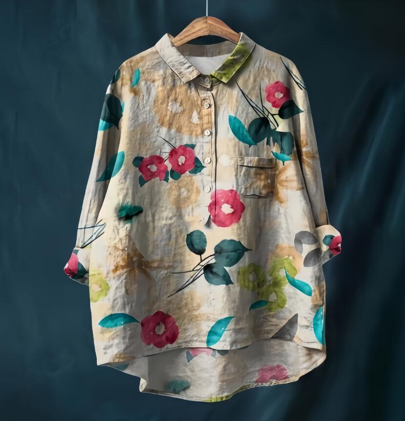 新入荷~カジュアル シャツ ブラウス 着痩せ チュニック プリント柄 トップス レディース 長袖 ゆったり 大きいサイズ 体型カバー ~ブルー