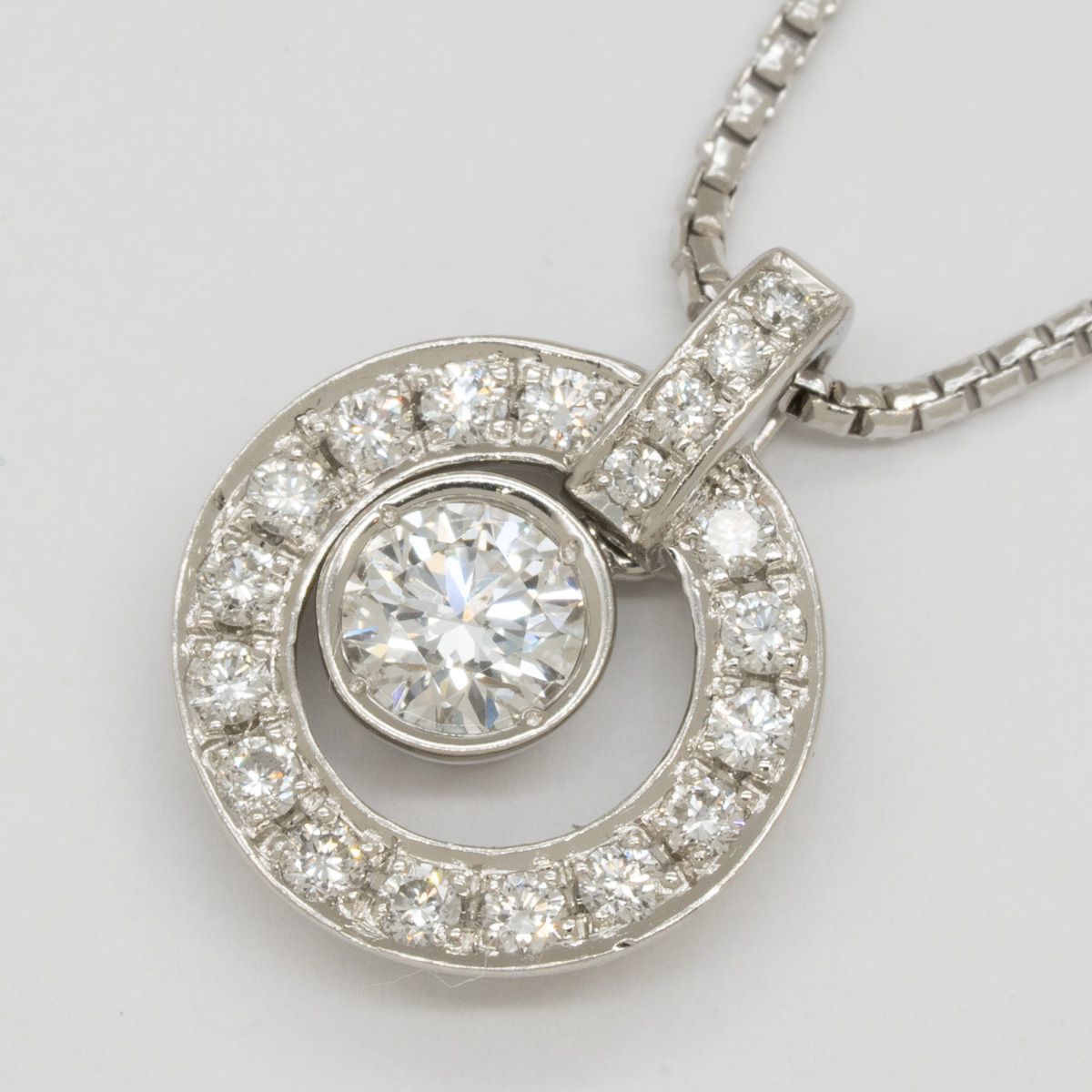 中央にインクルージョンが少なめの上質なダイヤをセッティングし、メレダイヤで装飾したペンダントネックレスになります。トップ裏面に小傷りますが目立つものではありません。