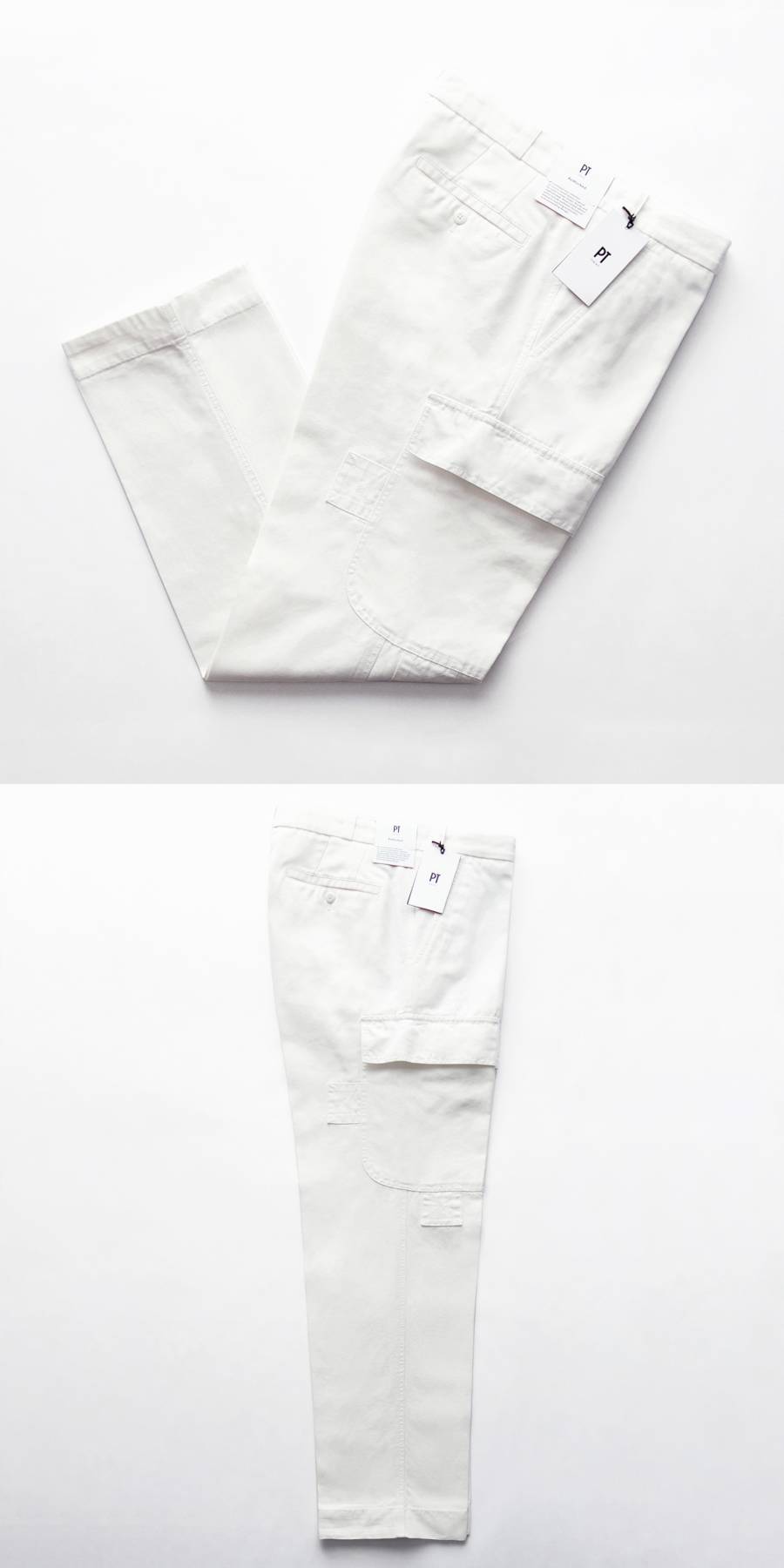 ご紹介するのは、「THE DESIGNER(デザイナー)」と名付けられた“カーゴパンツ”になります。ミリタリーパンツの王道を行くカーゴパンツですが、PTの手に掛かればご覧のとおり。本格的なテーラード仕立てを採用し、緩やかにテーパードを効かせた美脚効果の高いセミワイドシルエットをインプットすることで、カーゴパンツ本来の男らしさを損なうことなくカジュアルからモードまで合わせられるニュートラルなバランスを実現しています。滑らかな曲線を描くマチなしカーゴポケットやクロスステッチが施された別布補強、股部分のガゼットクロッチ、裾内側の靴擦れ布などのディテールが絶好のアクセントになって、このパンツを唯一無二のものにしています。ユルさ加減がちょうどいい今どきのフィッティングですが、膝下から裾へかけて緩やかにテーパードするPTならではの緻密に計算された設計になっているので、ゆとりがあるのにもたつかず、実際に穿くとすっきりと洗練されて見えます。若者が穿いている太めのカーゴパンツとの違いは一目瞭然。生地の上質感やシルエットの美しさがまるで違います。カジュアルスタイルはもちろん、ジャケットスタイルのハズシにも使える大人専用のカーゴパンツゆえ、期待以上の働きをしてくれると思います。