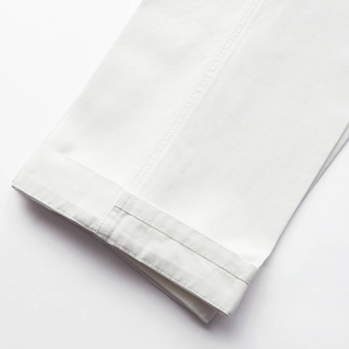 使用されている生地は、厳選されたコットンにリネンを加えた二者混素材から紡がれた細糸を緻密に織り上げた「COTTON & LINEN WORK PANAMA(コットンリネンワークパナマ)」という名称の平織物になります。春夏用の薄手生地というイメージのあるパナマですが、この生地の場合、細糸をハイカウントに打ち込むことによって上質感を損なうことなくヴィンテージのような味のある風合いに仕上げています。リネン混ならではのさりげない節(ふし)のある表情がポイントで、この生地をよりいっそう味わい深いものにしています。目付け(1平方メートルの生地の重さ)は390グラム。イタリアらしからぬしっかりとした打ち込みの生地ですが、見た目以上に目付け量が小さく、さらっとした爽やかな肌触りで汗をかいてもベトつきません。春先から秋口にかけての長い期間に着用して頂けます。ちょっとやそっとでは型崩れしないのでジーンズやチノパンのようにラフに扱えるところがいいですね。もちろん自宅で洗濯(水洗い)可能です。