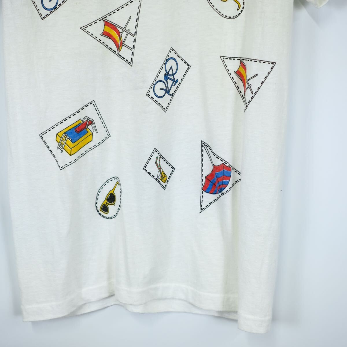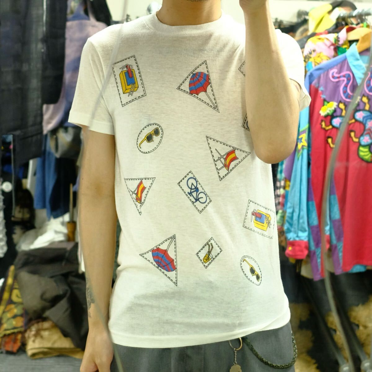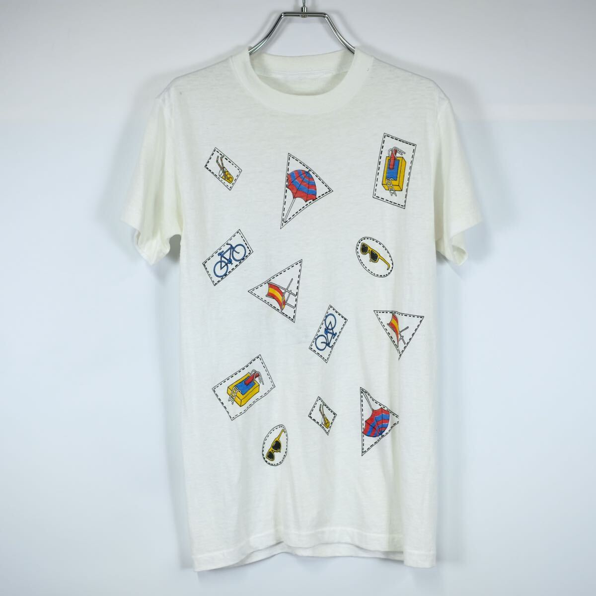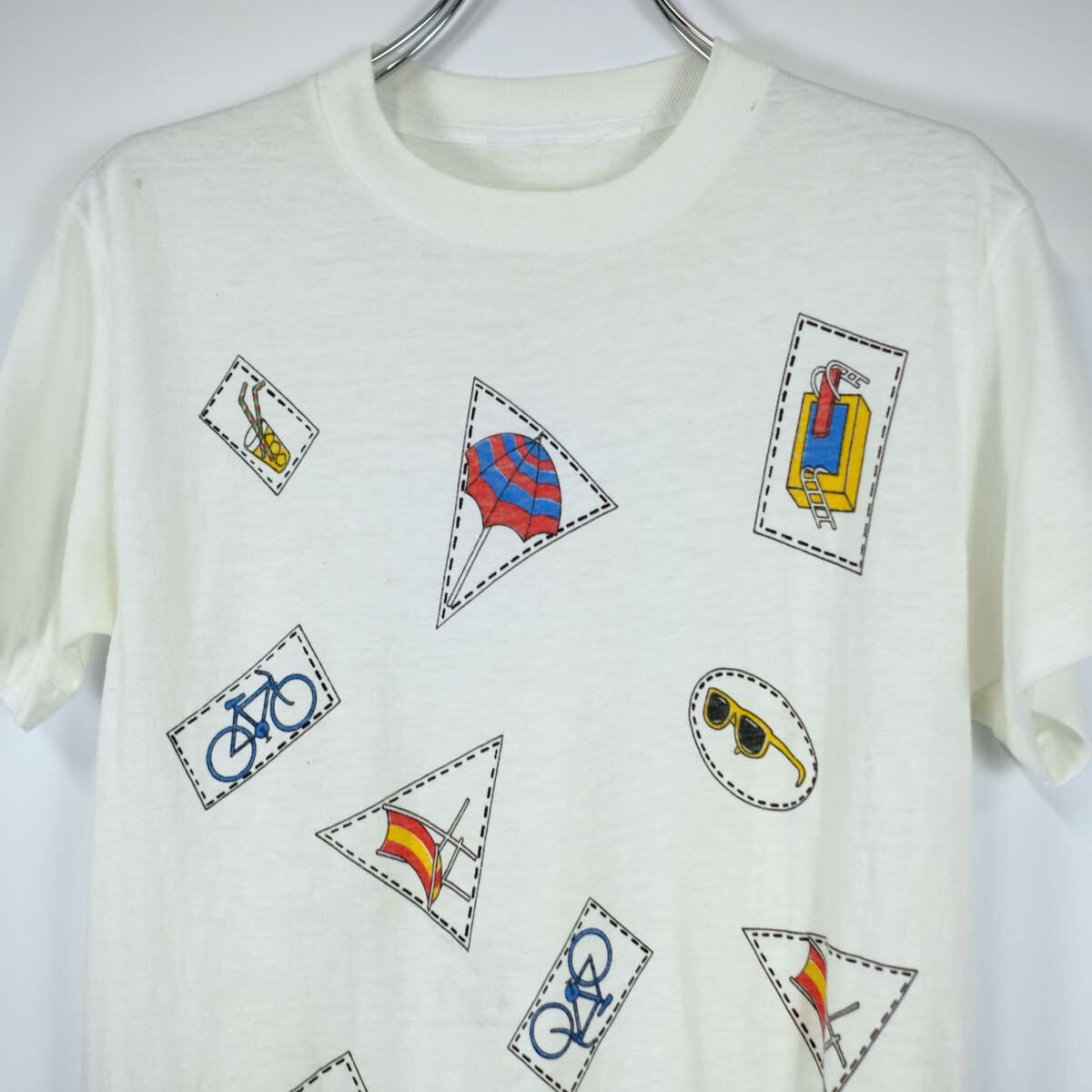 パラソルやサングラス、自転車などのフラッグのようなイラストがプリントされたデザイン。