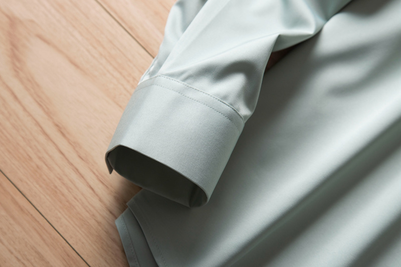 シルク混素材を使用した長袖メンズシャツ。形態安定加工により、洗濯後もシワになりにくく、お手入れが簡単です。