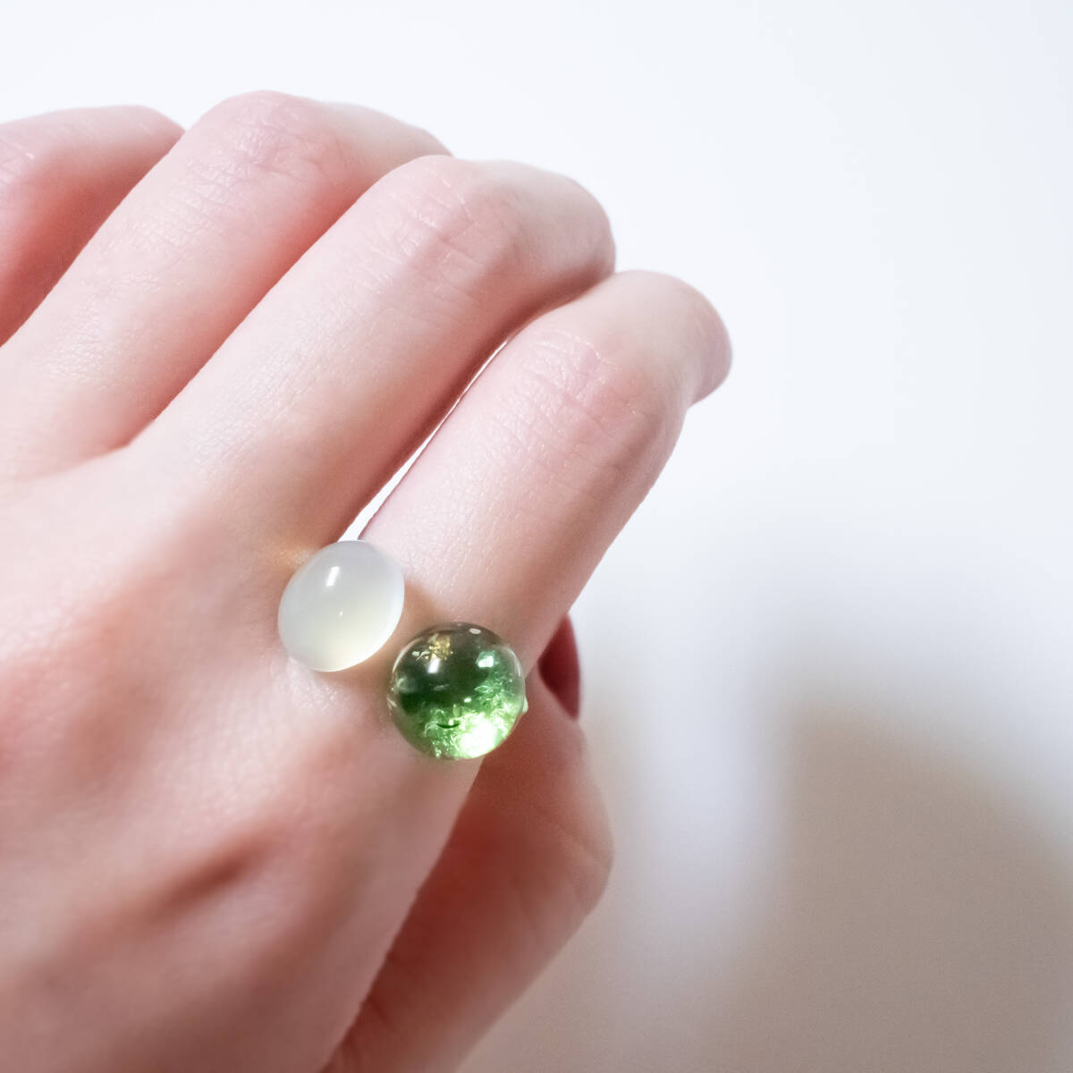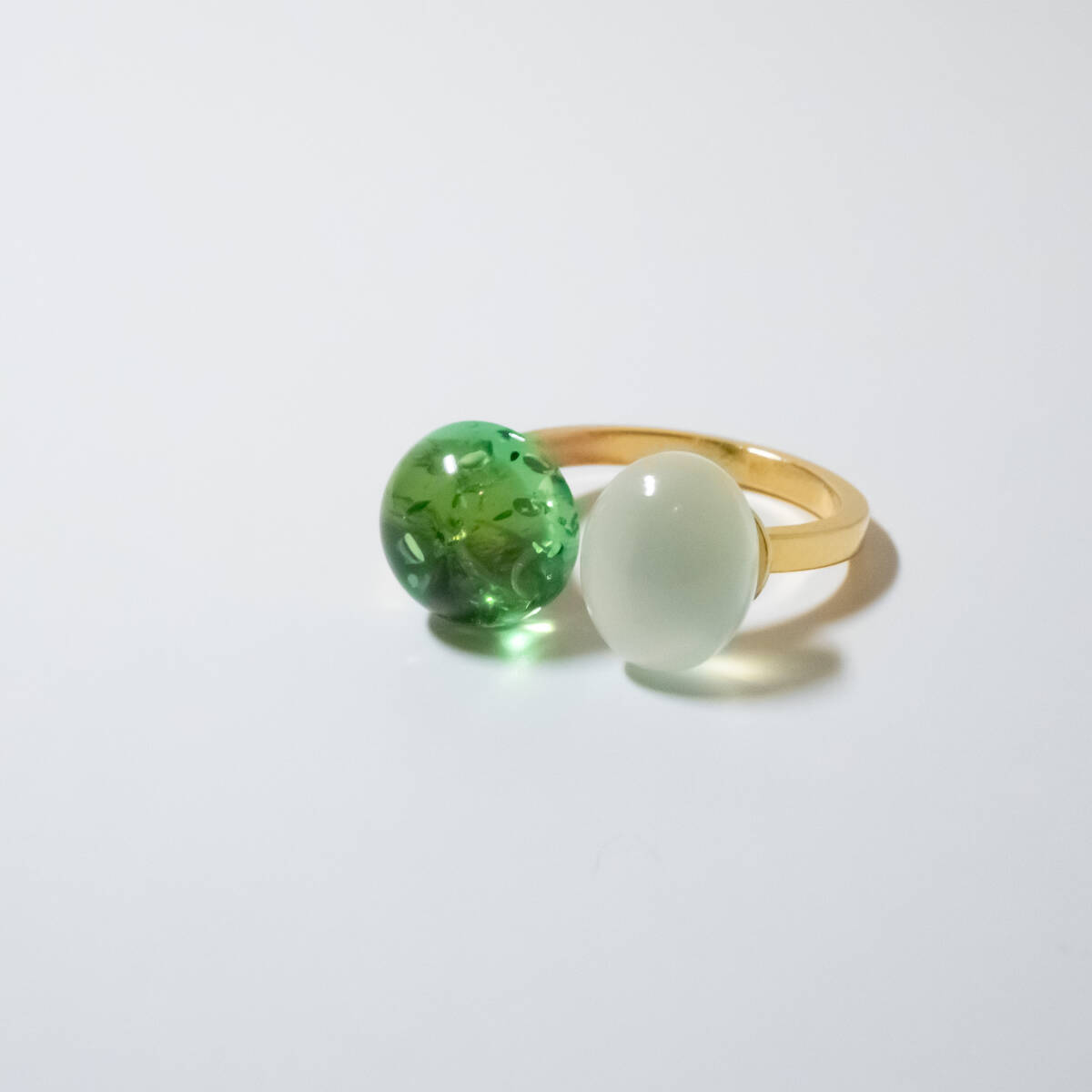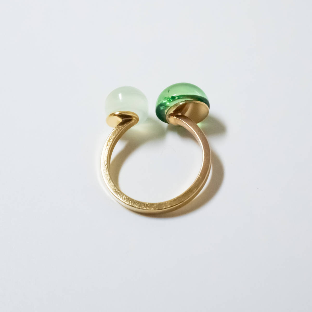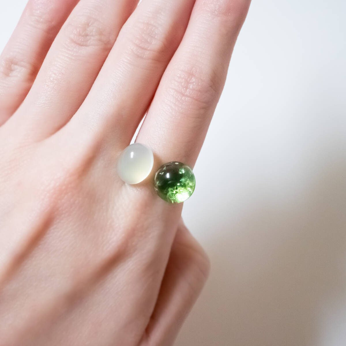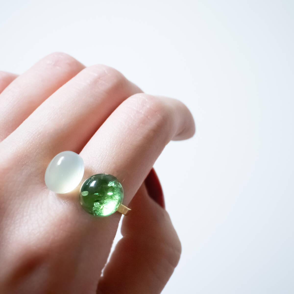 同系色で合わせやすくもありながら個性的な指輪です。