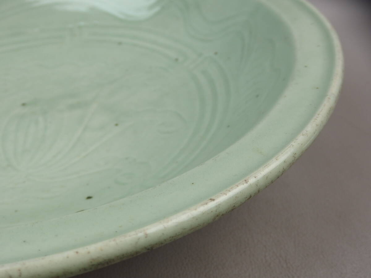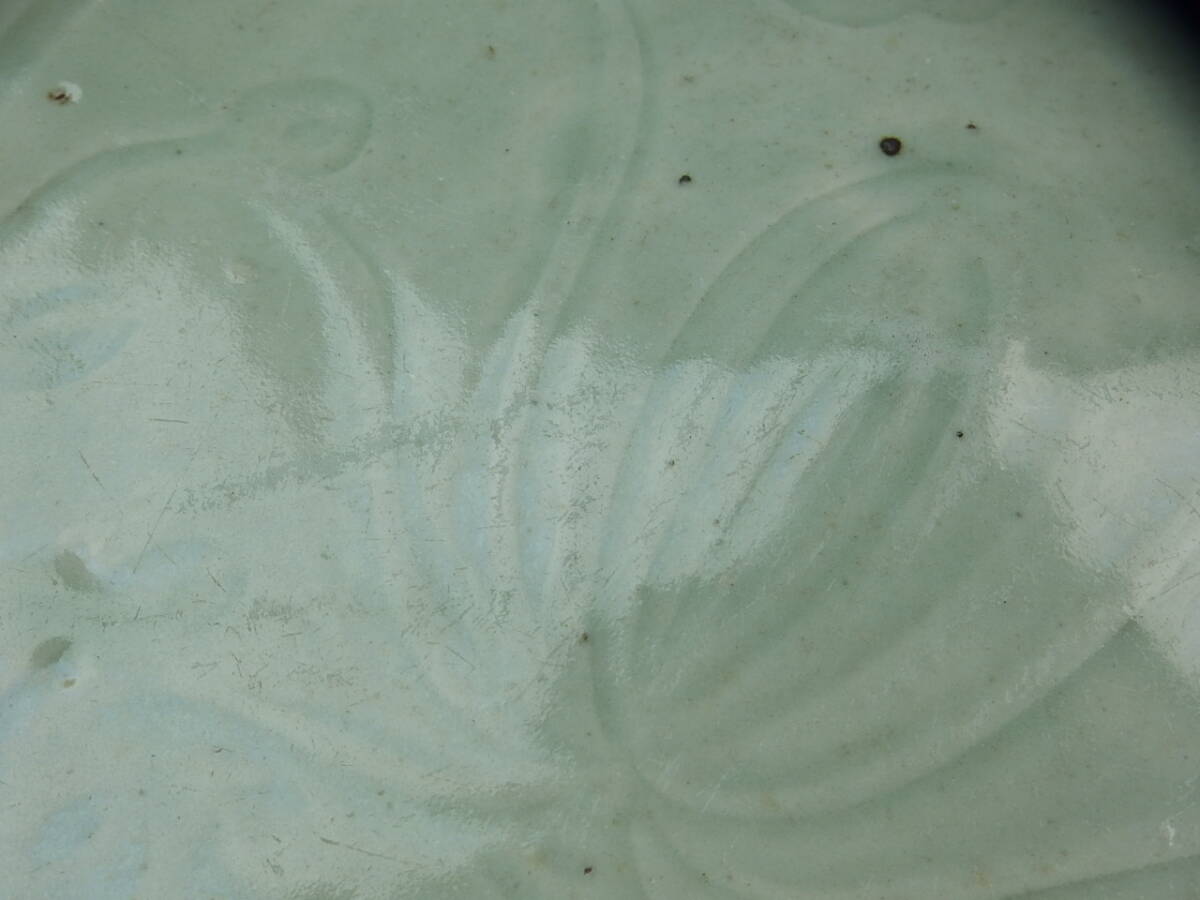 とても迫力にあふれ美しい青磁釉に印刻が施された逸品です。