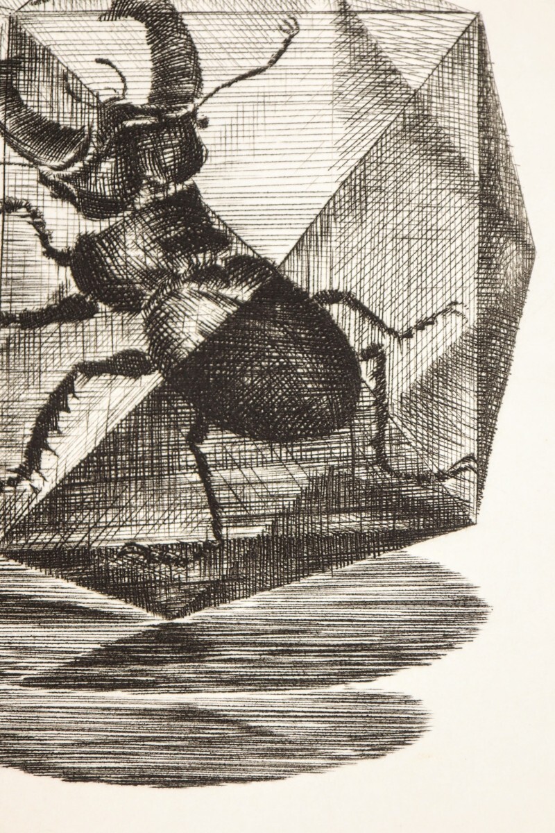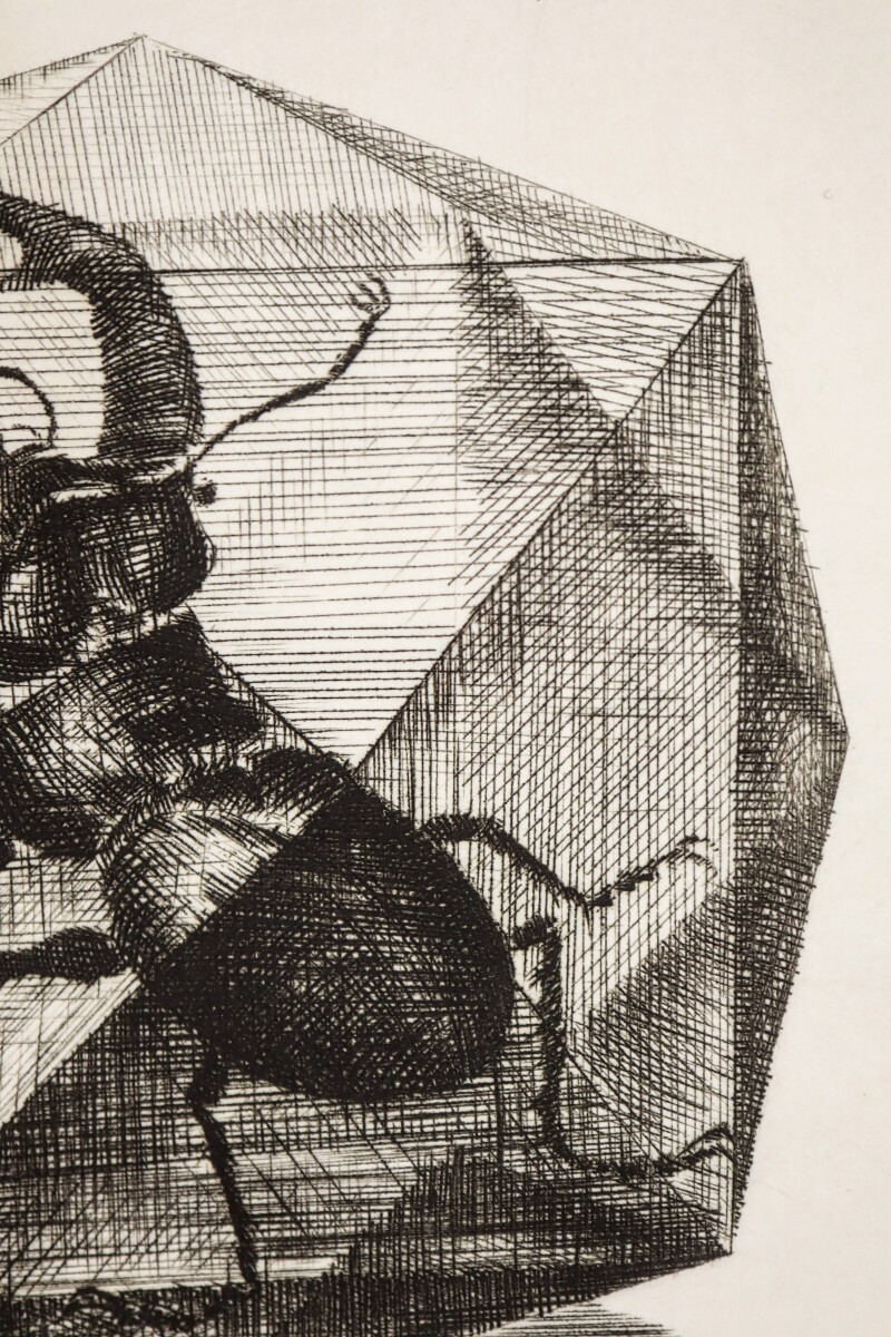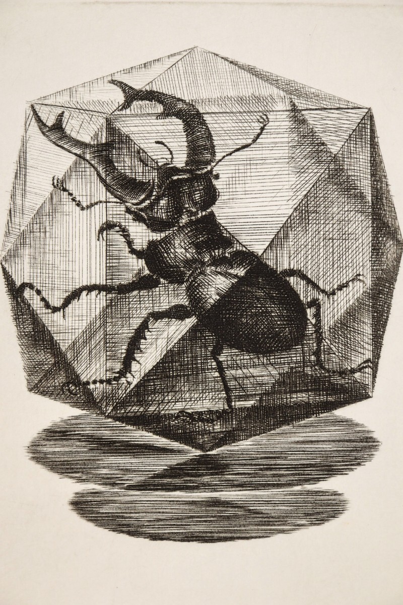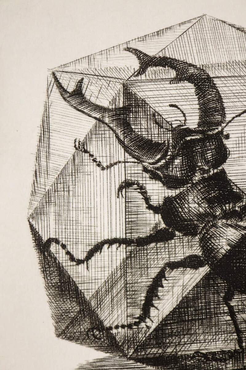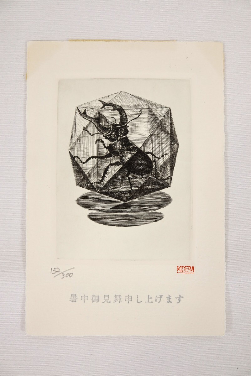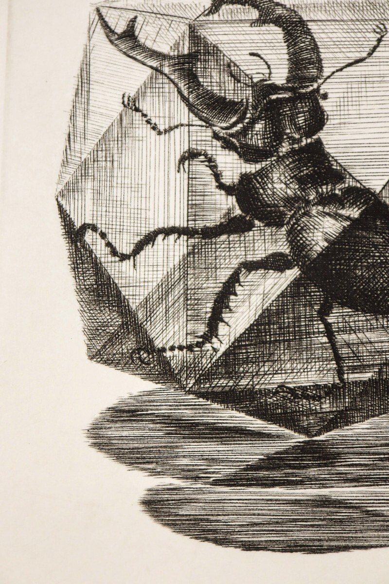 真作 木寺啓幸 1988年銅版画「クワガタ」画寸7×9.5cm 長崎県出身 和光大学芸術学科講師 暑中見舞の葉書の裏面 多面体のカゴ様の鍬形 10981