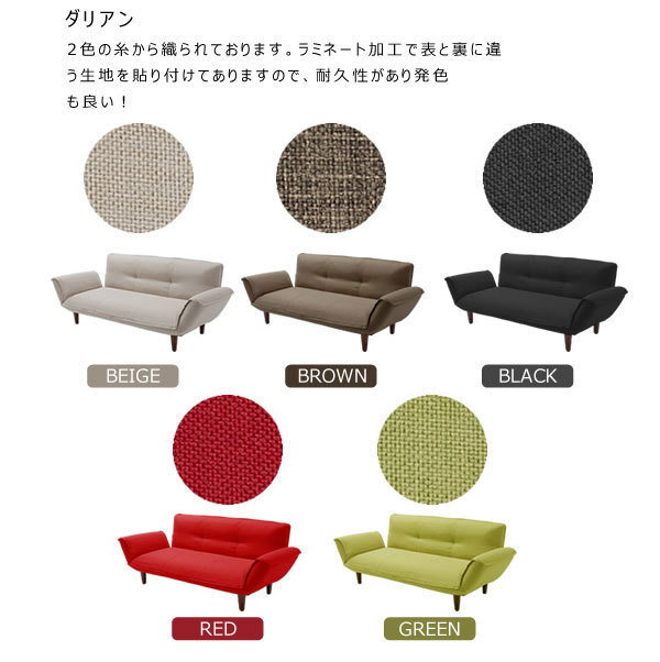 【サイズ】 サイズ:幅1580~1960x奥行き750~1090x 高さ170~500x座面の高さ170 (脚なしの場合) 【素材】 構造材:スチールパイプ クッション材:ウレタン モールド成型 コイルスプリング 脚:樹脂脚 背と肘は5段階でリクライニングします。 【製造国】日本製 脚は樹脂脚150mmです。 | ||