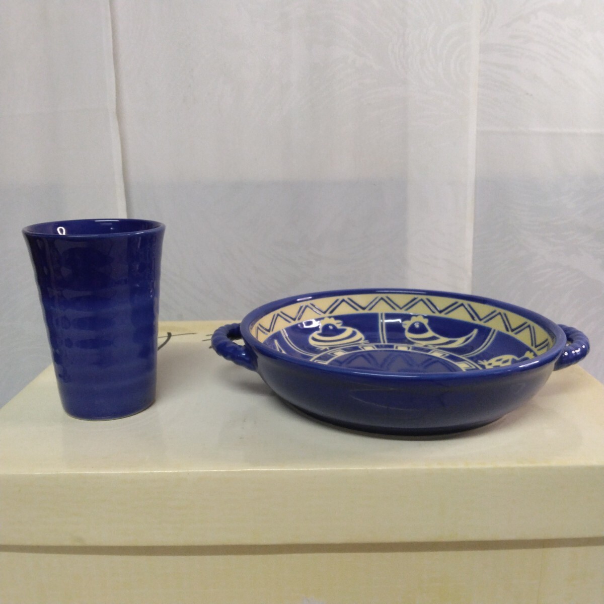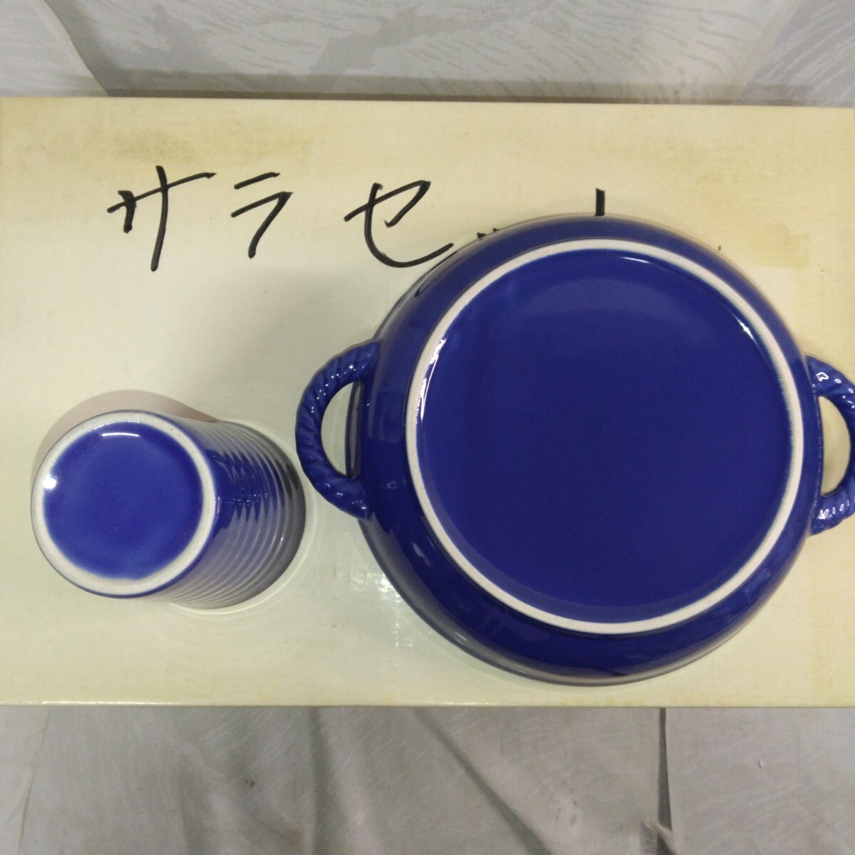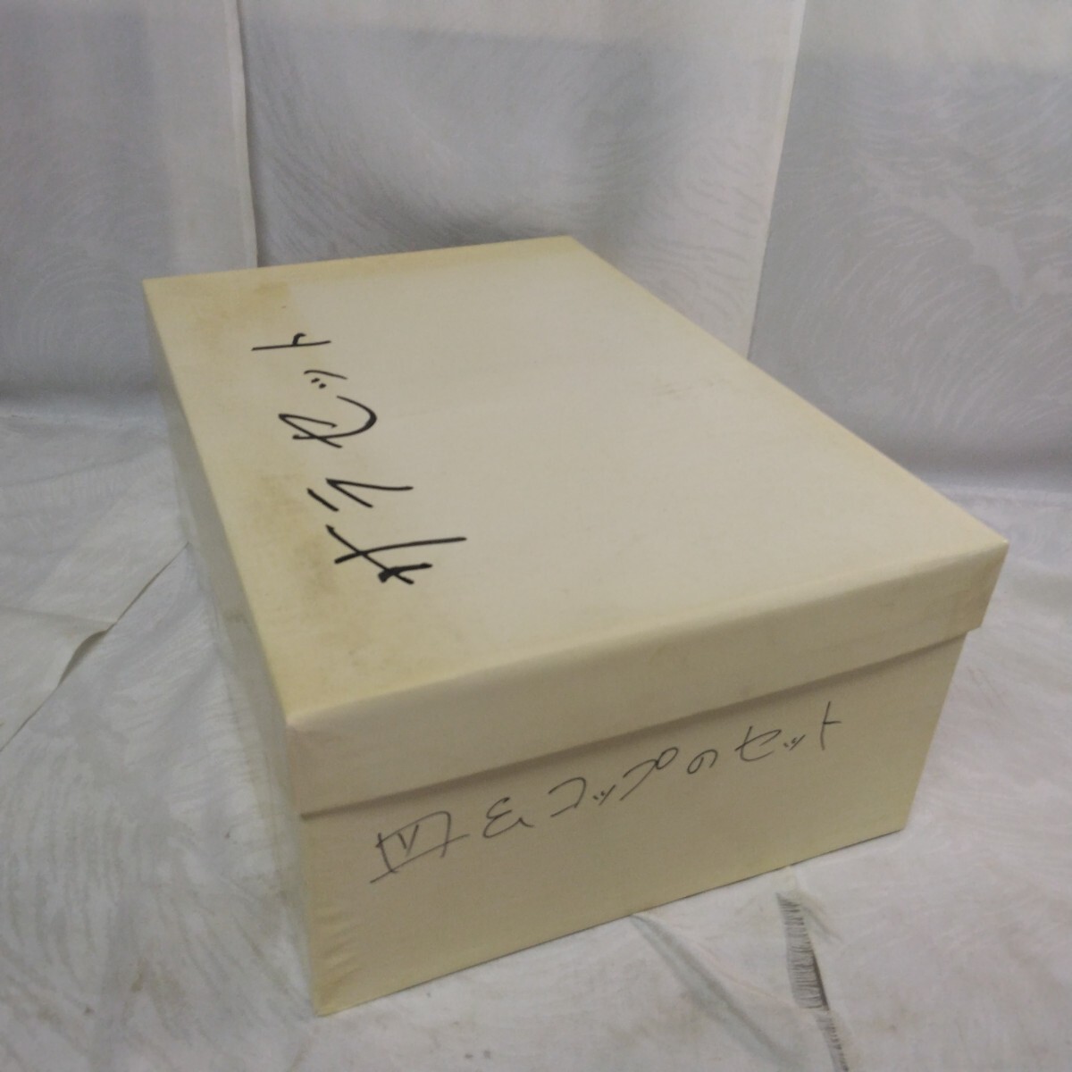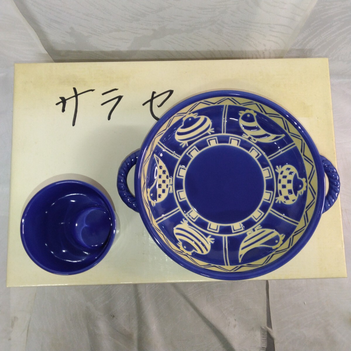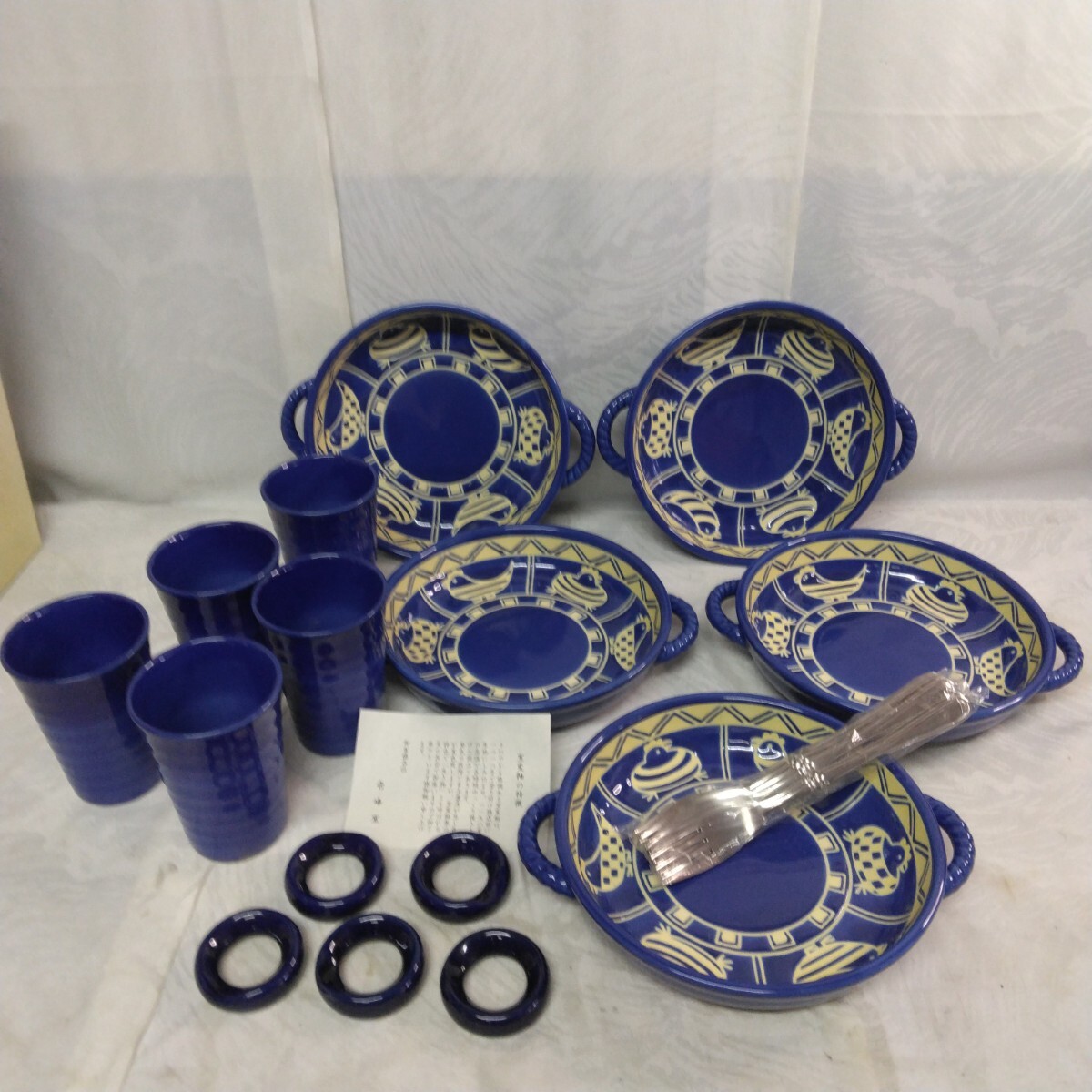 美品【壱峰窯 ニューオードリー】 カップ5客 パスタ皿5枚 フォーク付 箸置き付セット 陶器 青色 ニワトリ柄 鳥の絵 食器 箱付