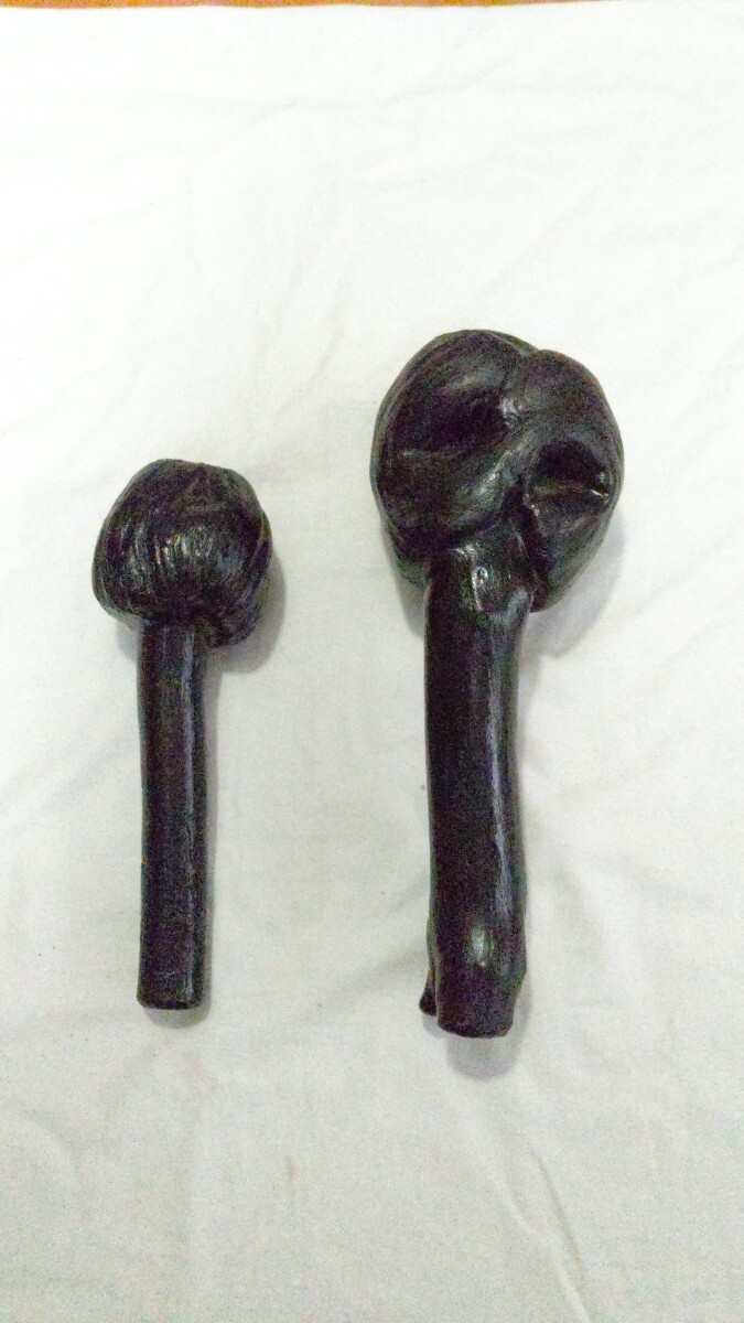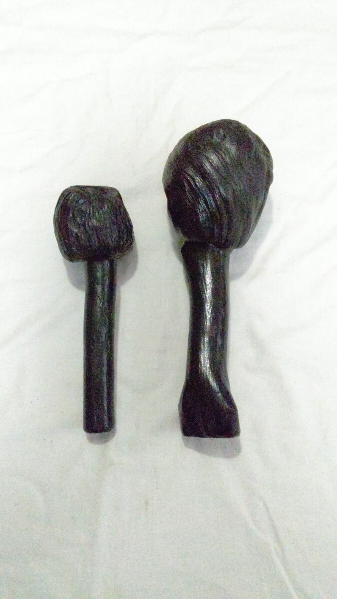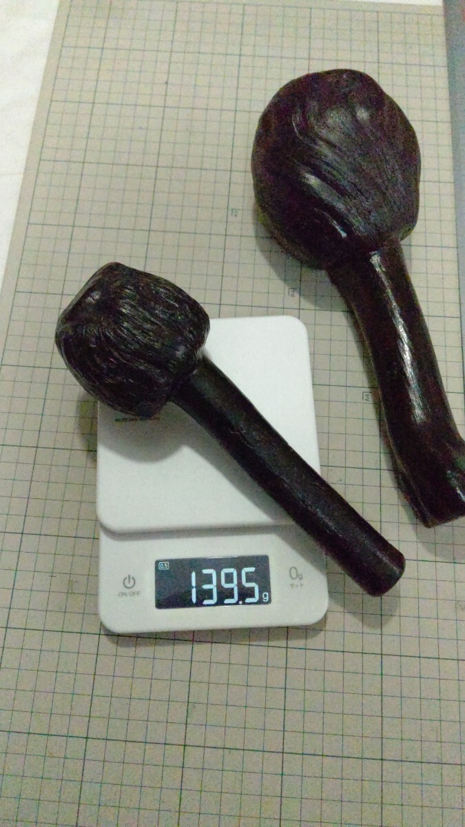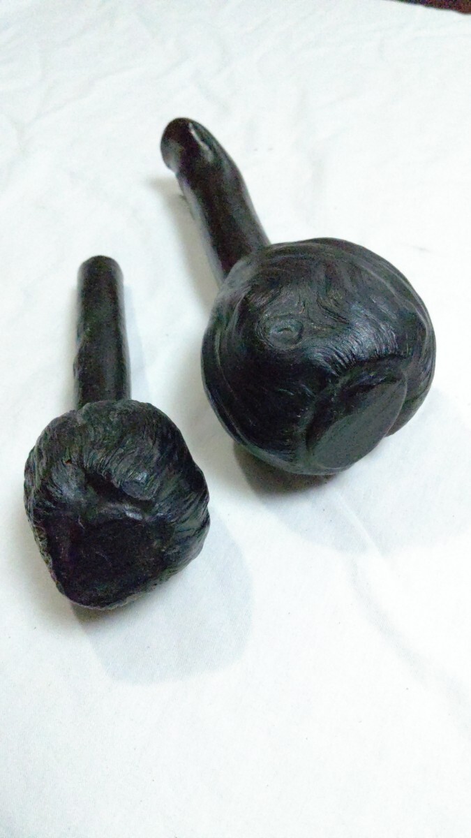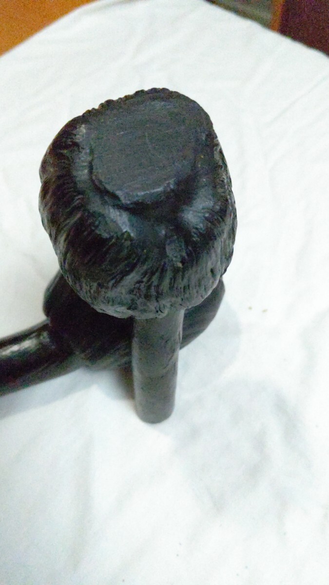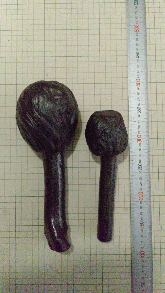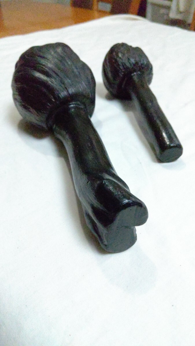 こちらは、親戚からいただいたものになります。おそらく、法要などで導師が入場する際に手にする法具の「如意」だと思われます。大小2個セットになりますが、黒く塗られているため、材質がわかりません。おそらく天然の木の瘤と枝を使ってあまり手を加えないようにした如意のようで、色々と調べてみましたが、正体不明です。如意(小)の瘤の部分に2箇所目立つ穴が開いています。画像にてご確認ください。