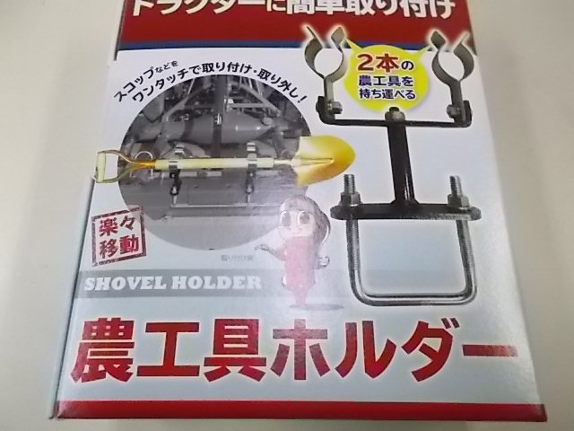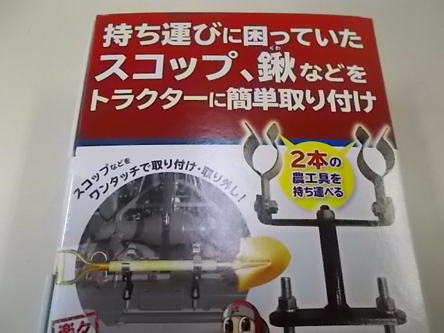 ロータリーのツールバーや、軽トラックの鳥居などに挟み込んで装着後、スコップ等の持ち運びがワンタッチで楽々移動、便利になる商品、日本全国送料無料商品です。