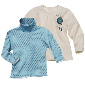 青磁色に濃い紫のドッツが入ったロールネック Tシャツとオフホワイトにお花のアップリケが