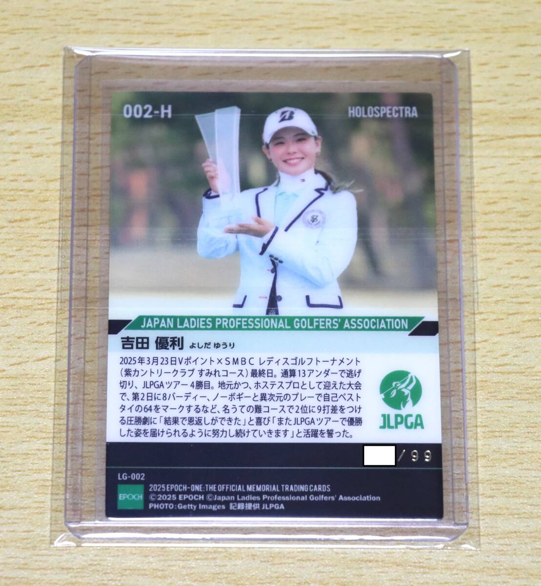 女子ゴルフ 吉田優利 EPOCH ONE エポックワン ホロスペクトラカード SMBCレディスゴルフトーナメント 2年ぶりのツアー優勝 プロゴルファーです。気に入って頂けた方の落札を心よりお待ちしております。ゆうパケットポストminiで両面段ボール補強にて発送致します。定型郵便の場合は片面段ボール補強となります。どうかよろしくお願い致します。