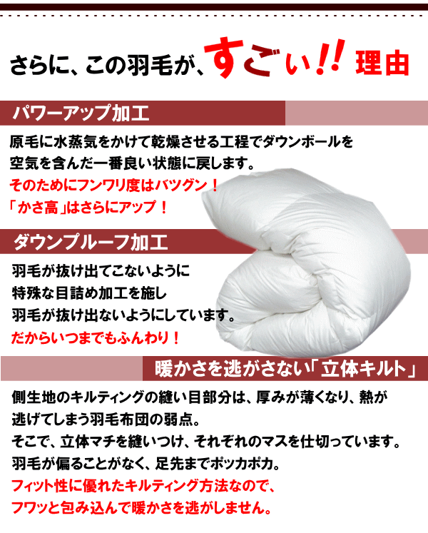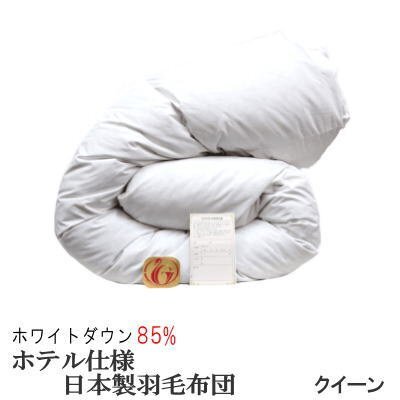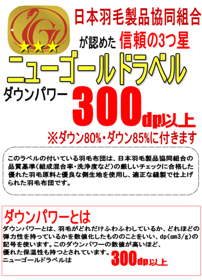 こだわりの日本製羽毛掛ふとんです。ホワイトダックダウン85%、高品質の羽毛をたっぷり使ったフワフワの羽毛布団。ニューゴールドラベル・品質保証書付きです。