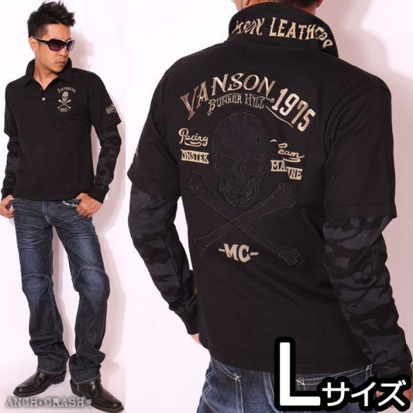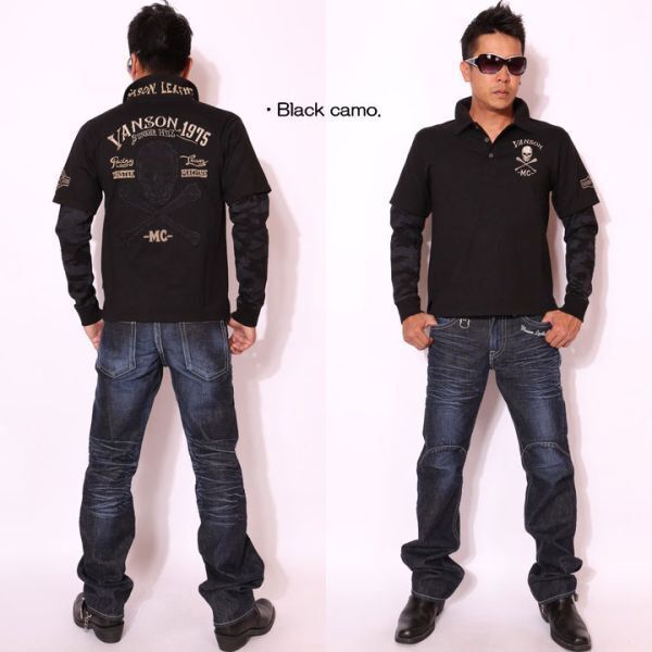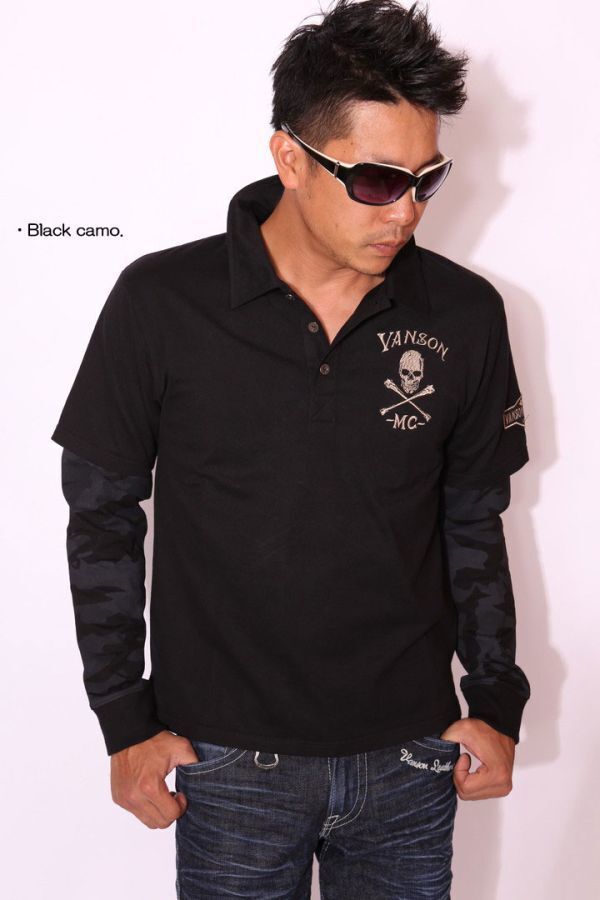 当店別注 VANSON バンソン フェイクレイヤード 長袖 ポロシャツ ブラック×袖ブラックカモ【Lサイズ 】NVPS-519 バイカー アメカジ 刺繍