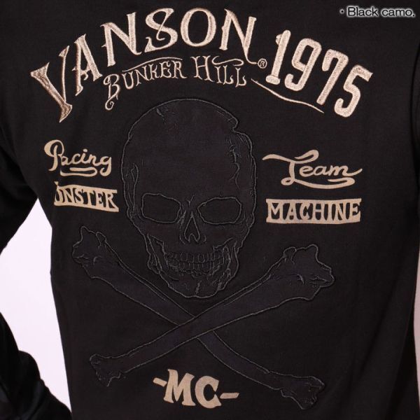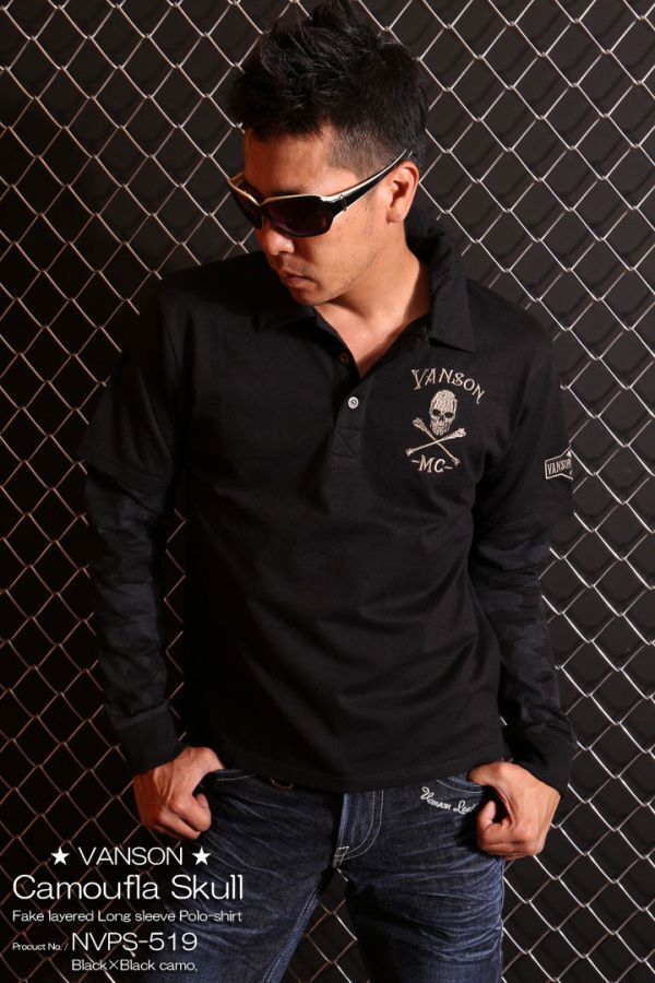 『アメリカが生んだ革の魔術師』高品質で世界中に愛される伝説のバイカーズブランド【VANSON(バンソン)】、カモフラ スカル 刺繍 フェイクレイヤード 長袖ポロ!