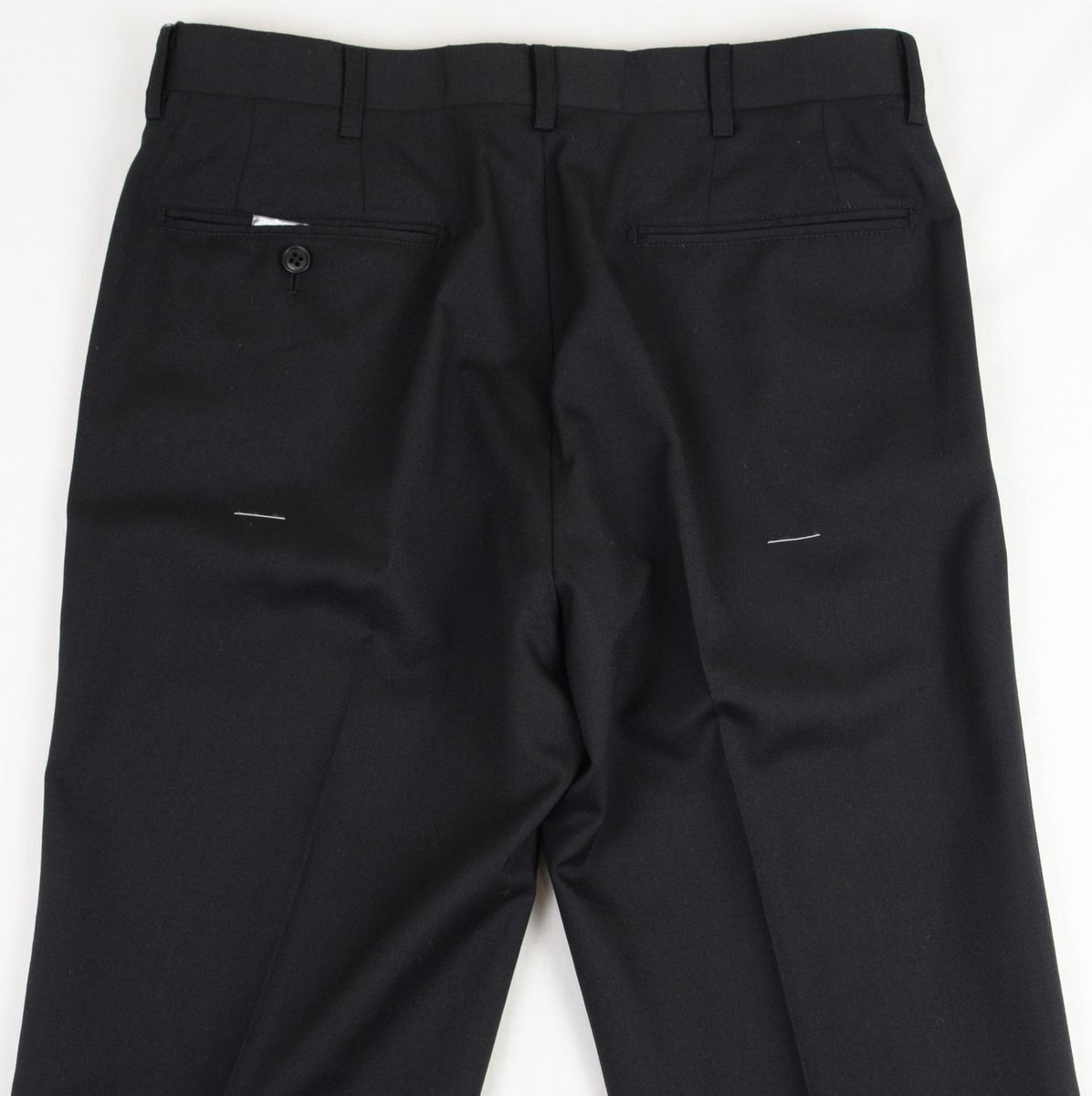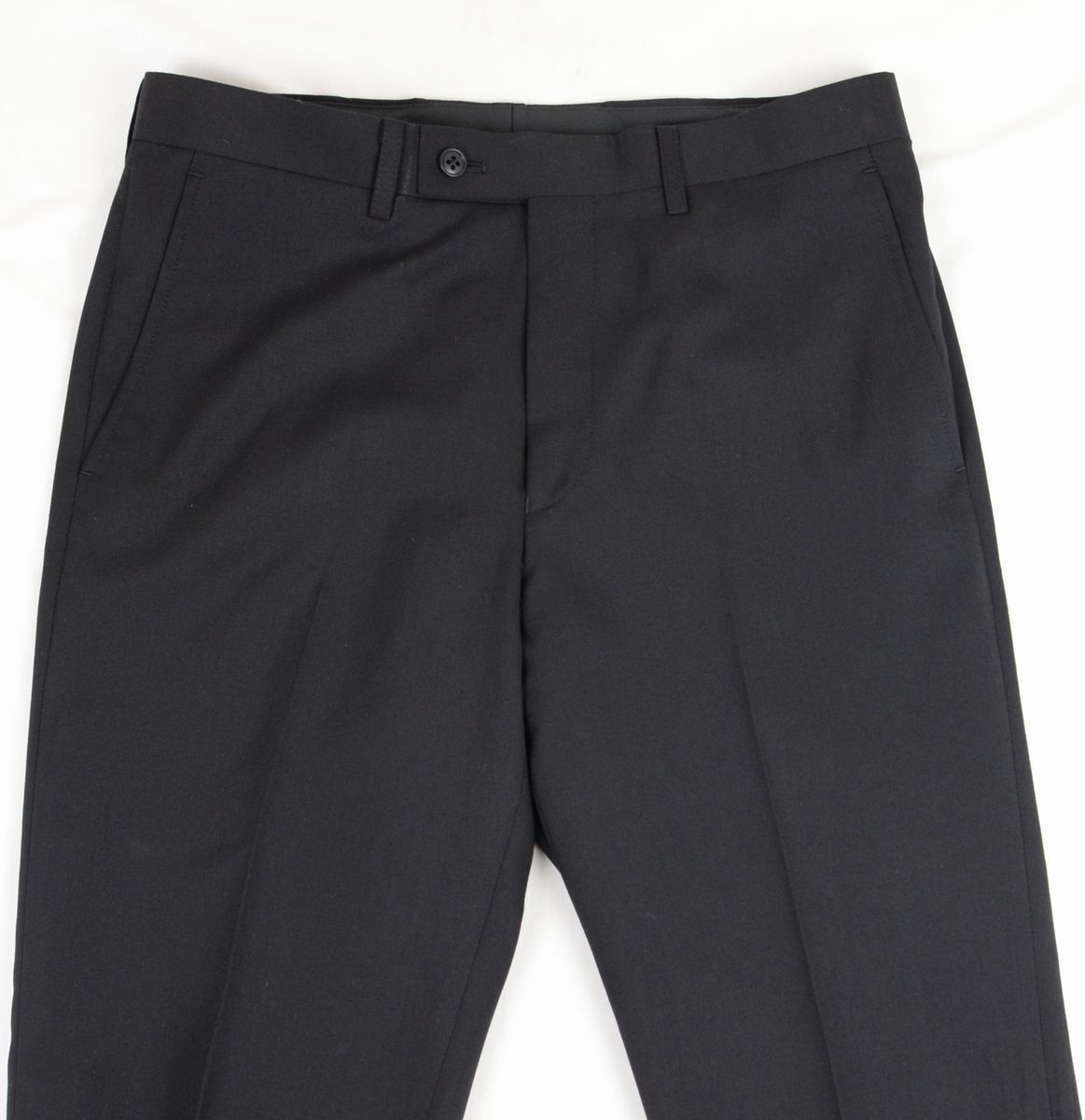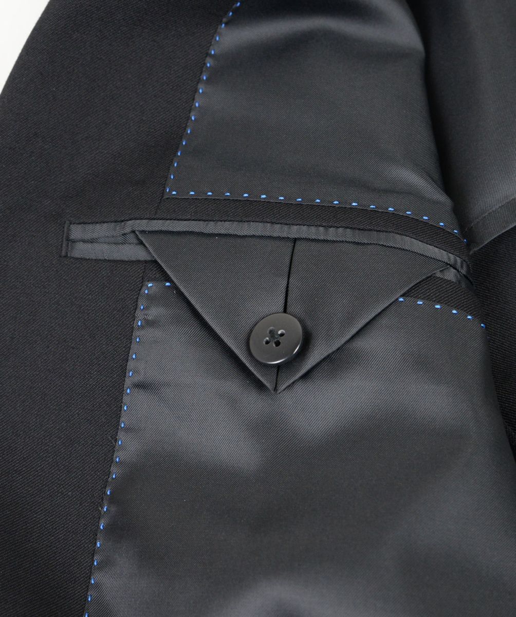 背抜き、2ボタン、センターベンツになっています。内側のポケットは、右側がフラップ付きボタン付になっています。パンツは、ノータックで、左後ろのポケットはボタン付になっています。